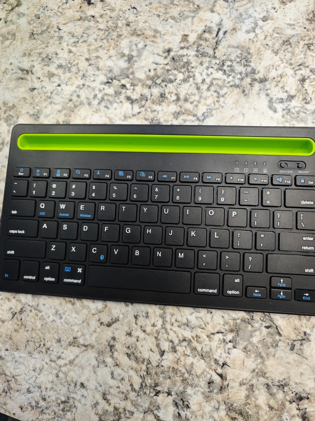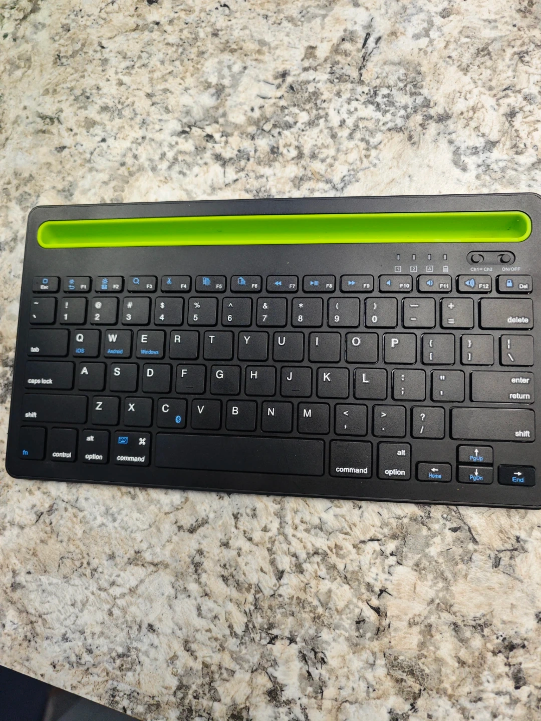 Selling a black wireless keyboard that's compatible with iOS, Android, and Windows. It has a bright green accent at the top, which can also be used as a stand for your phone or tablet. Perfect for anyone who needs a compact and versatile keyboard!