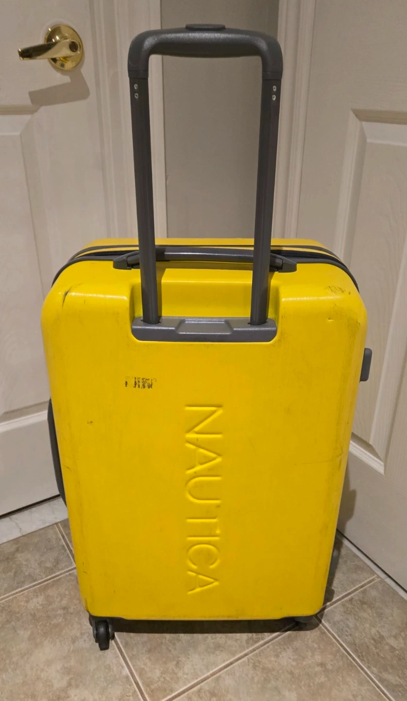 Selling a yellow Nautica suitcase, medium size 24". It's expandable, so you can pack a bit more. There are some scratches on the exterior from use, but it's still fully functional and ready for your next trip.