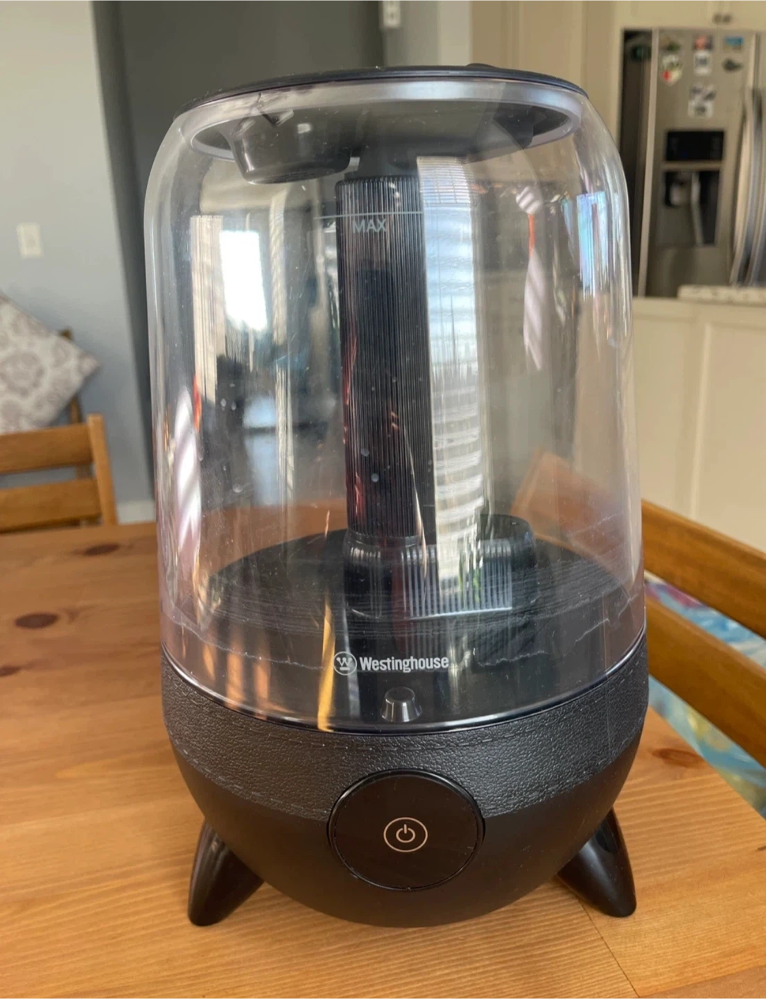 Westinghouse air purifier in great condition! It features a sleek design and is perfect for improving air quality in your home. It has a clear top and a black base with the Westinghouse logo on the front. If you're interested, please send me a message!