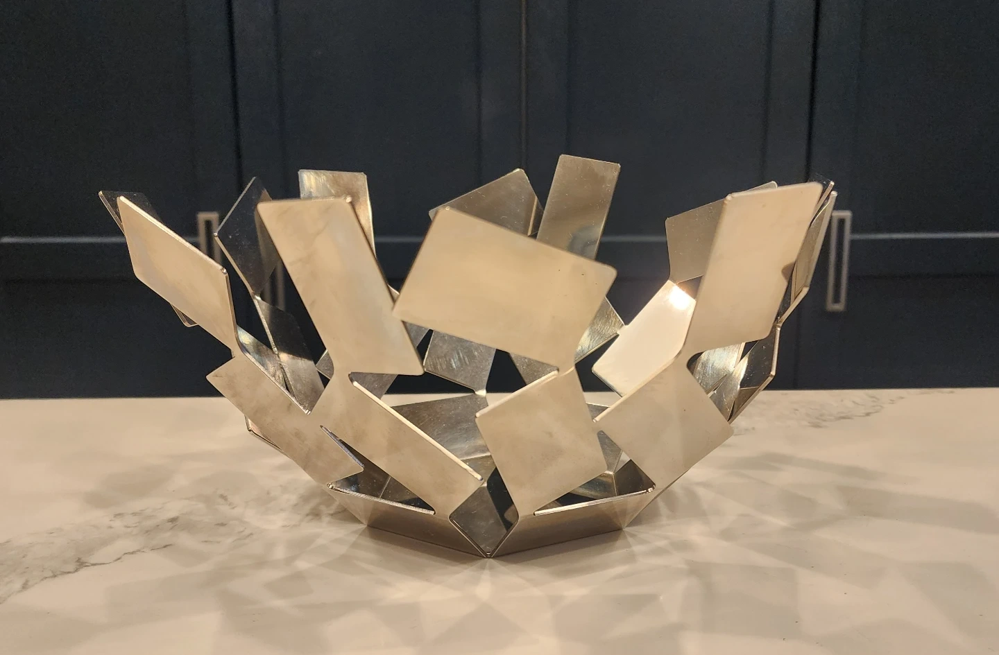 Elevate your home decor with this striking Alessi "La Stanza dello Scirocco" fruit bowl, designed by Mario Trimarchi in 2009. Crafted in Italy from mirror-polished 18/10 stainless steel, the design features geometrically irregular pieces that create a beautiful play of light and shadow. It's a true statement piece for any kitchen or living