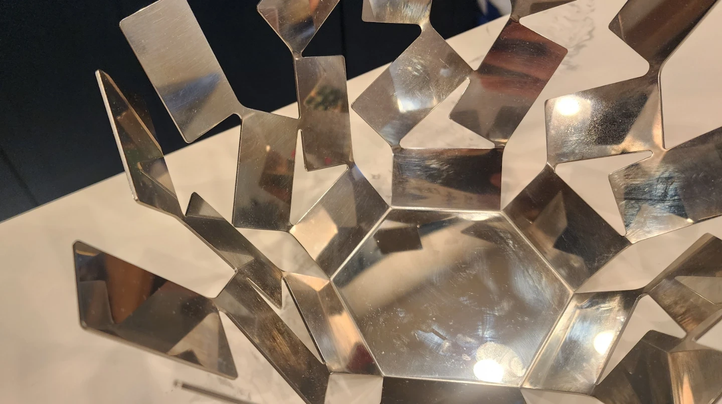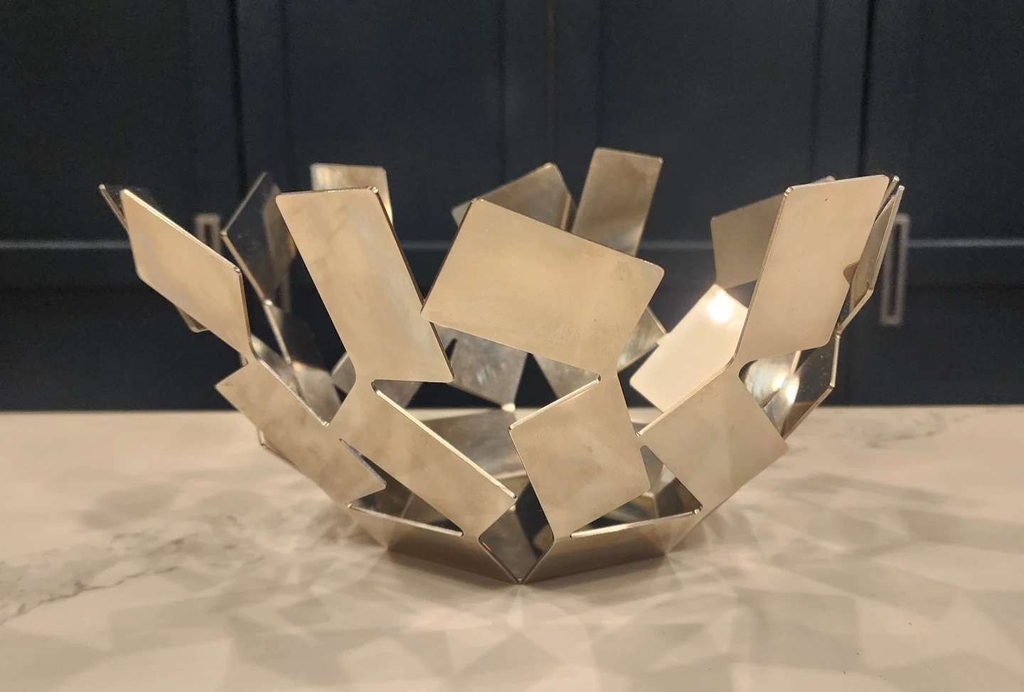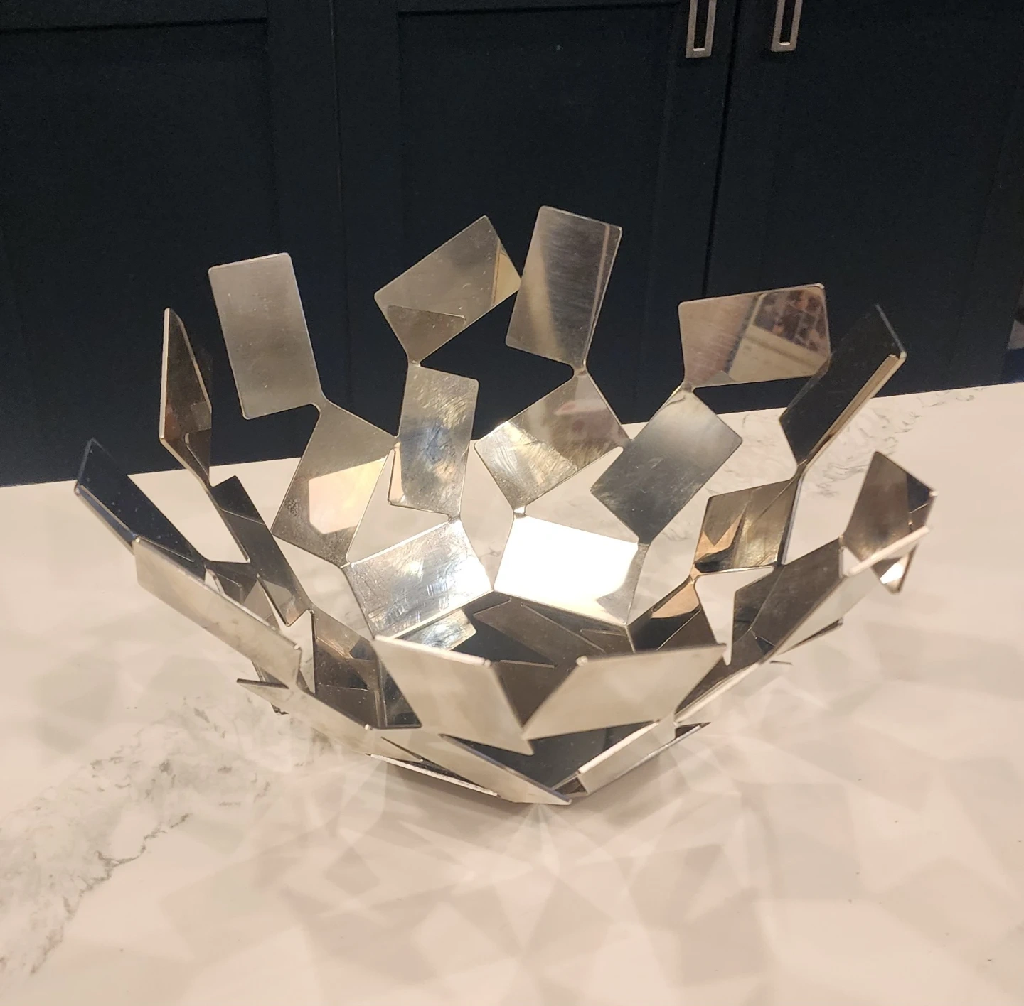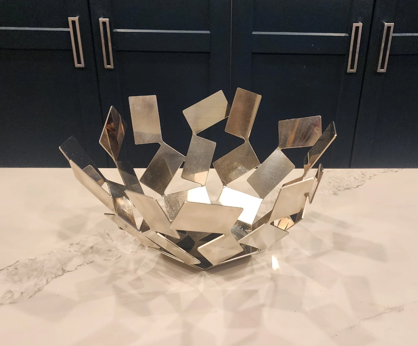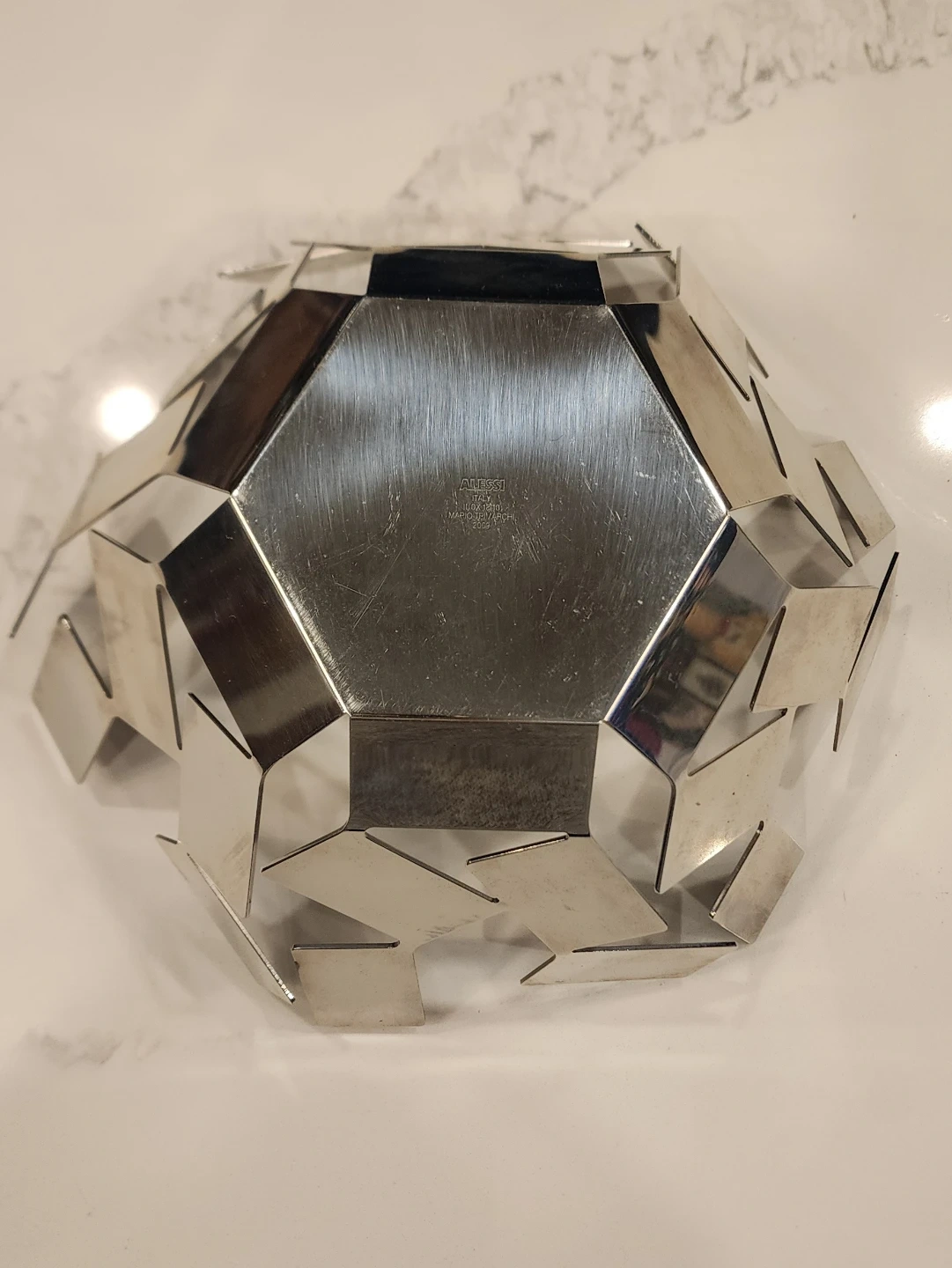 Elevate your home decor with this striking Alessi "La Stanza dello Scirocco" fruit bowl, designed by Mario Trimarchi in 2009. Crafted in Italy from mirror-polished 18/10 stainless steel, the design features geometrically irregular pieces that create a beautiful play of light and shadow. It's a true statement piece for any kitchen or living