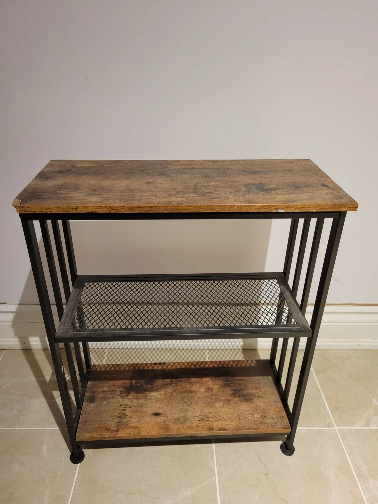 Selling a brown and black end table. It has a metal frame and the top measures approximately 20 inches by 26 inches. There is some damage to one corner of the top.