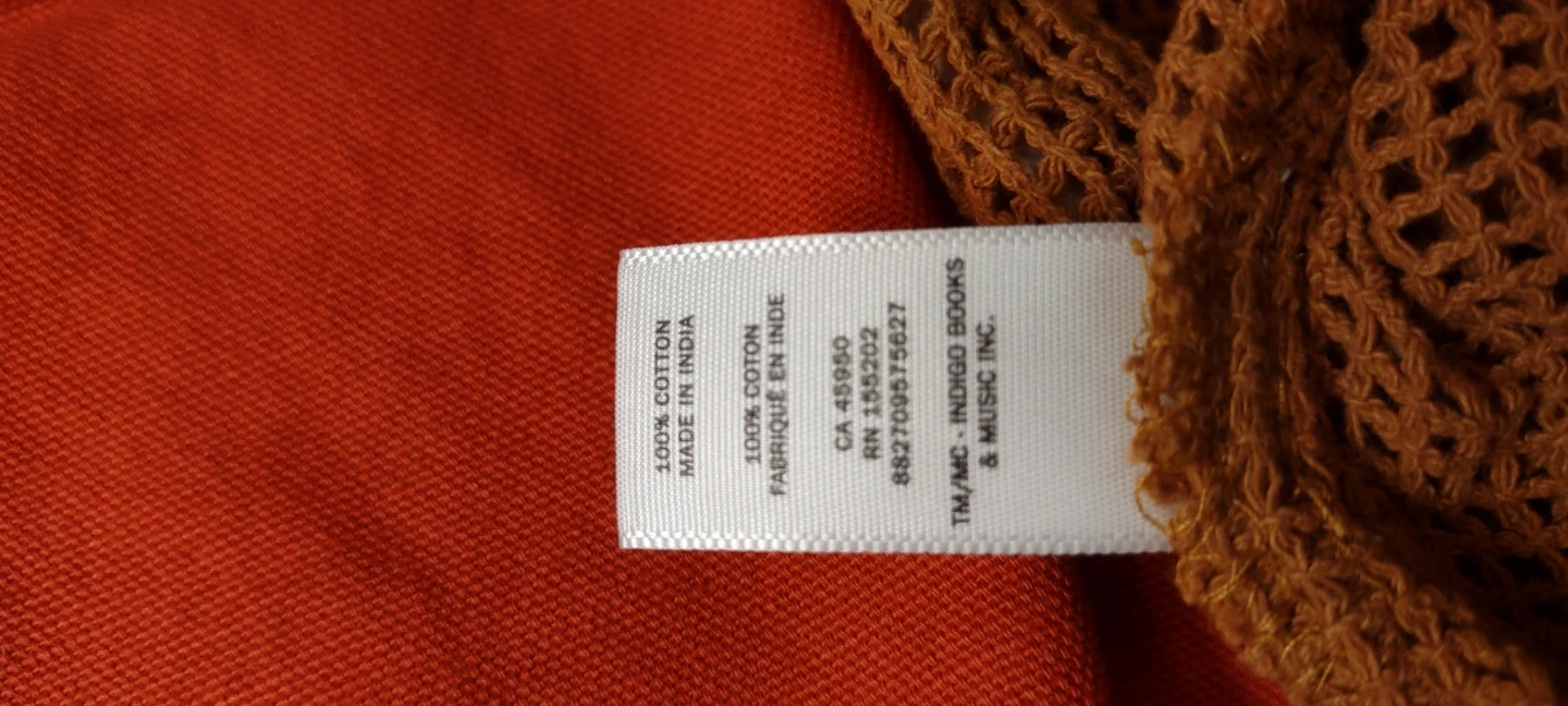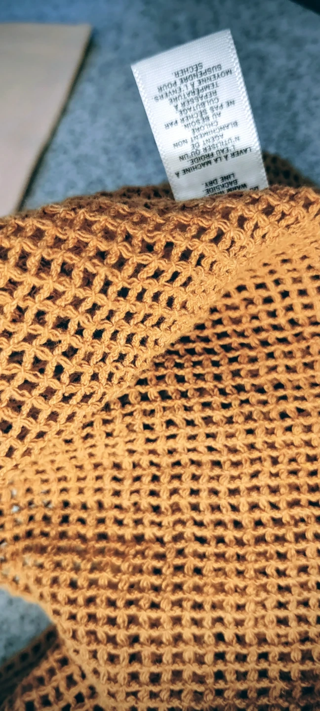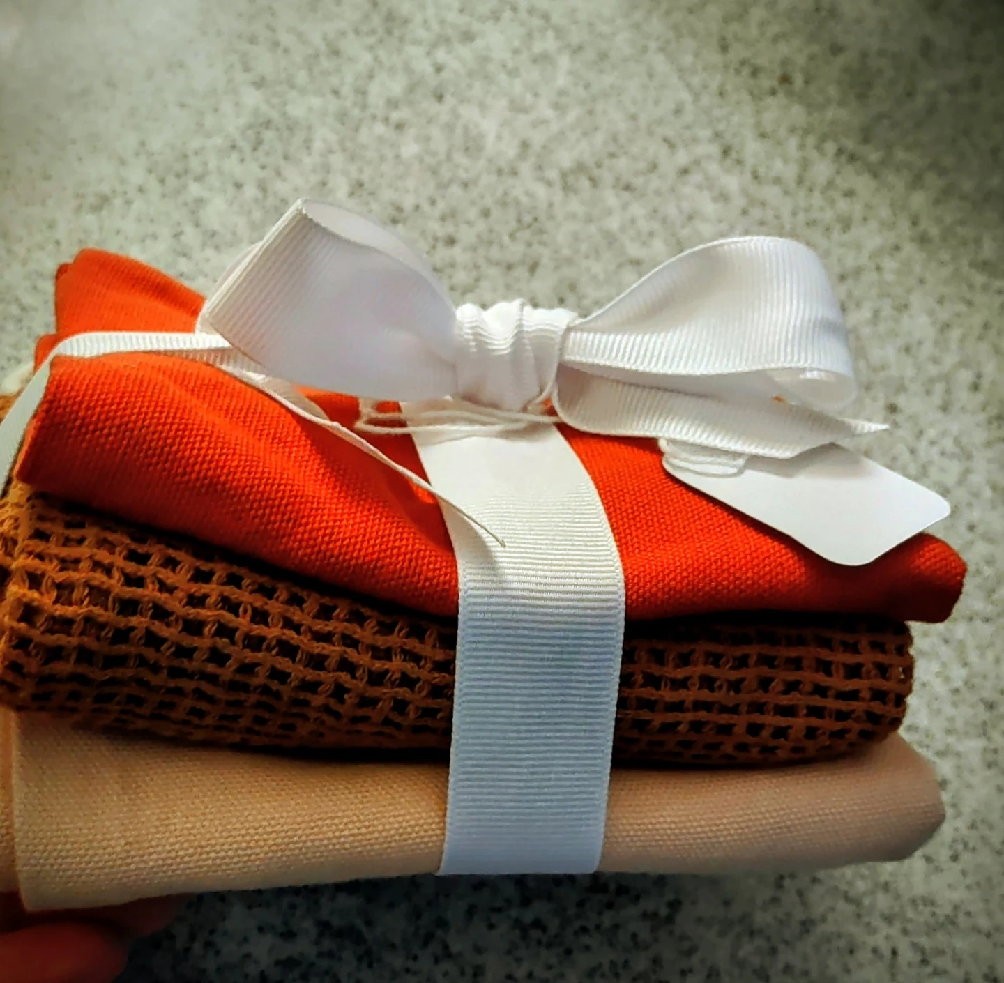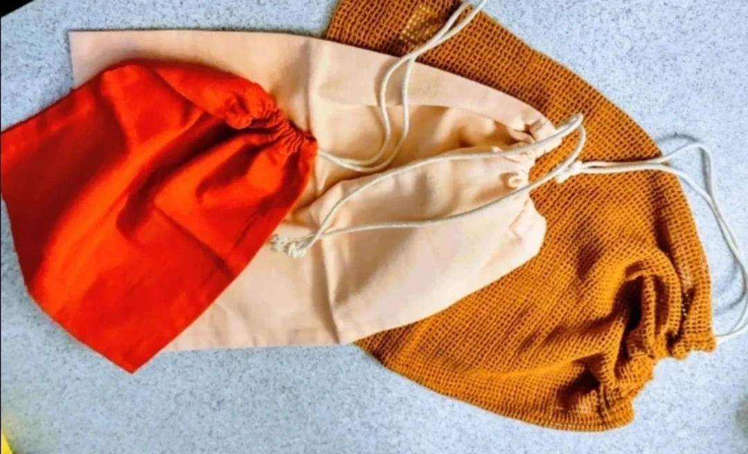 Selling a set of three reusable produce bags! One is a nice orange colour, another is a light beige, and the third is a lovely mustard-yellow mesh design. They're perfect for groceries or other storage needs!
