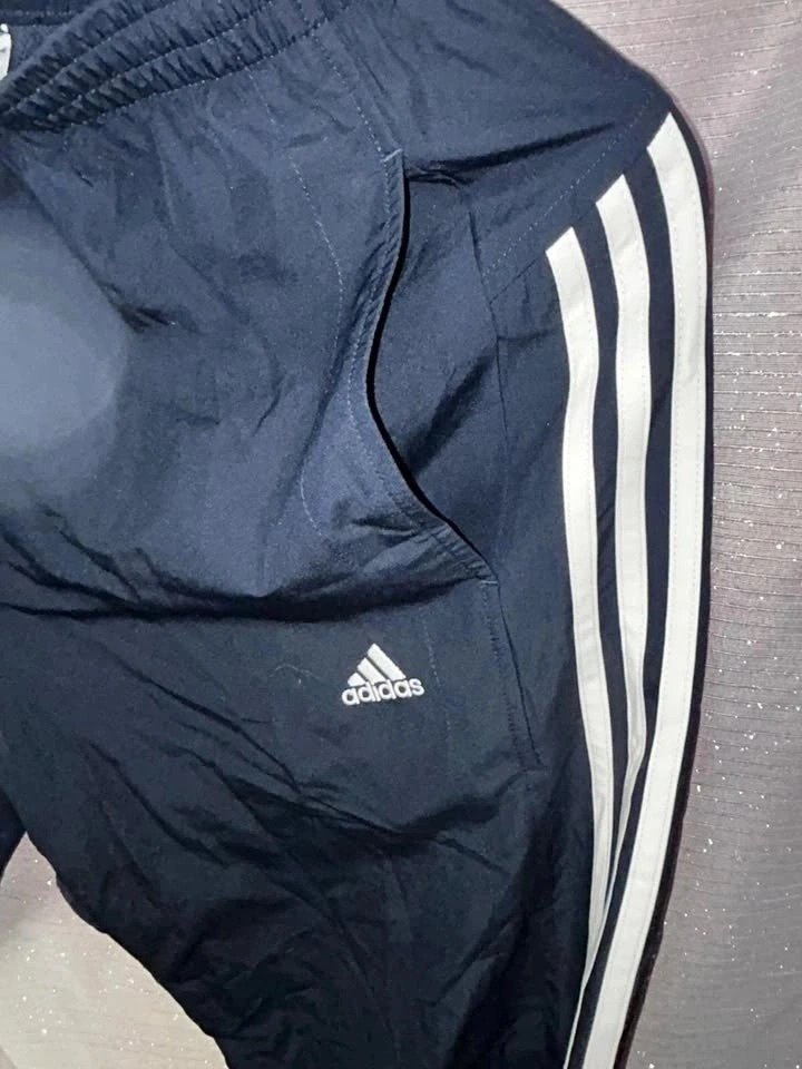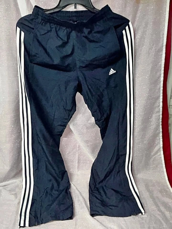 Adidas men's Windbreaker pants. Tagged men's size L (large). These are black in color with the three white stripes down each leg. I also got the windbreaker jacket to go with it for another 30