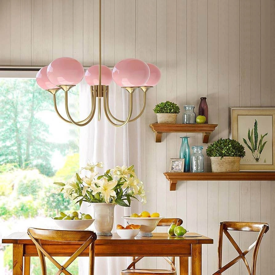 5 Light Gold Globe Sputnik Chandelier Modern Pink Glass Sputnik Pendant Lights Kitchen Island Mid Century Vintage Brushed Brass Ball Chandelier Light Fixture for Bedroom Dining Living Room