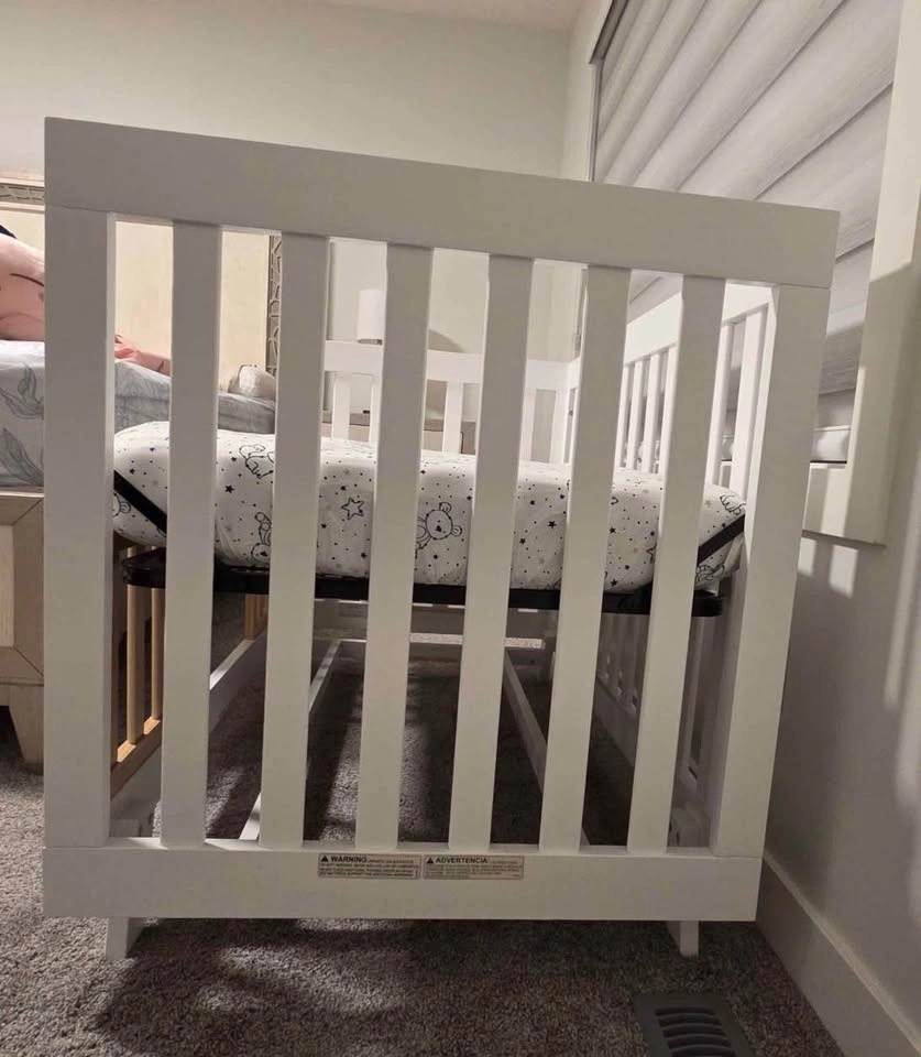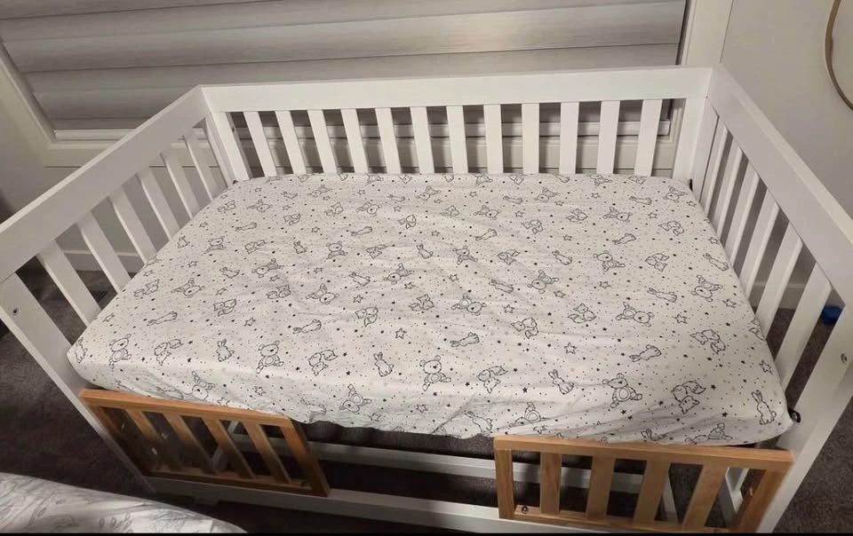 Stockcraft Beckett 3 in 1 convertible crib. Comes with Simmons Perfect Slumber Crib Mattress, Organic Cotton and Universal 2 gaurdrails and cotton sheet. Almost brand new, comes with a box as well. Retails for over $500 but selling the complete combo for only $300