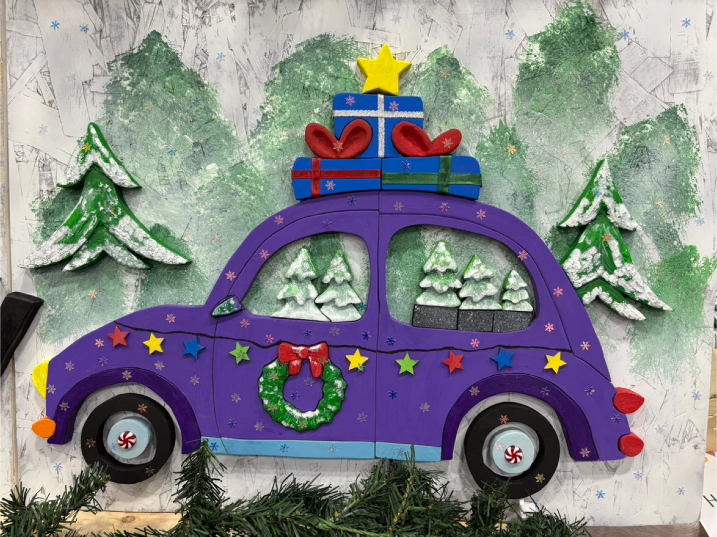 This is a charming, handmade wooden wall art piece featuring a purple car decorated for Christmas! It has little Christmas trees inside and presents on top, perfect for adding a festive touch to any room during the holiday season Size 24.5” x 18.5”