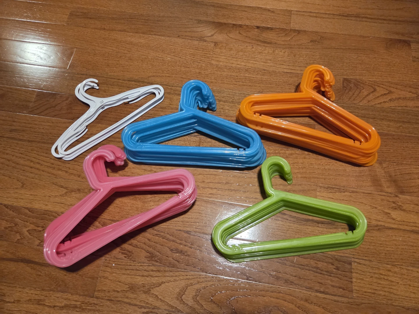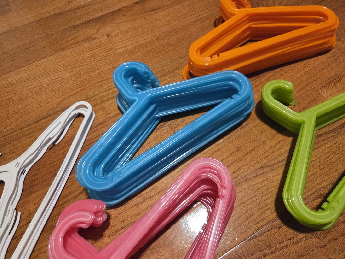 Children's clothes hangers from Ikea - mixed colors orange pink green blue.