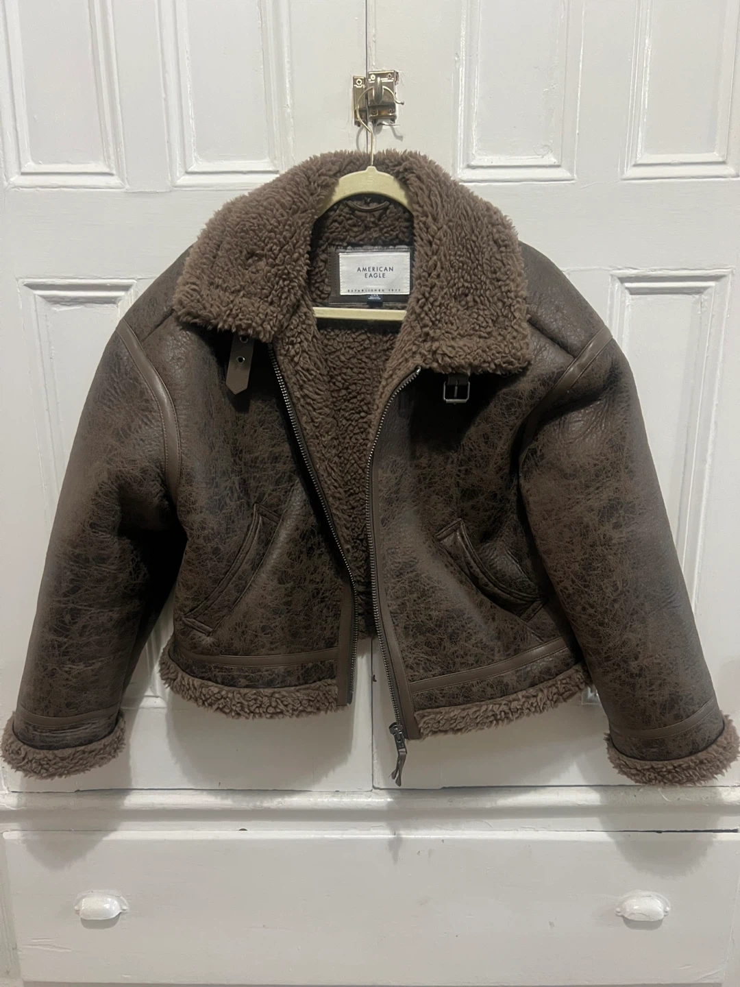 I'm selling an American Eagle aviator jacket in size Large. It's a stylish brown faux leather jacket with a cozy, plush lining. Perfect for adding a touch of cool to any outfit! So warm! So stylish! I just need the space in my closet.