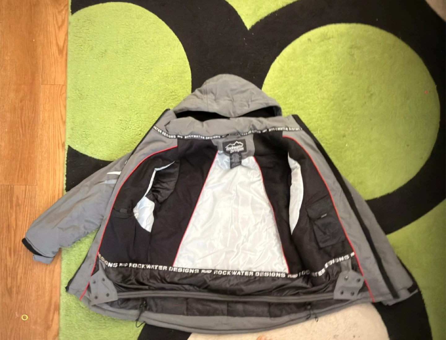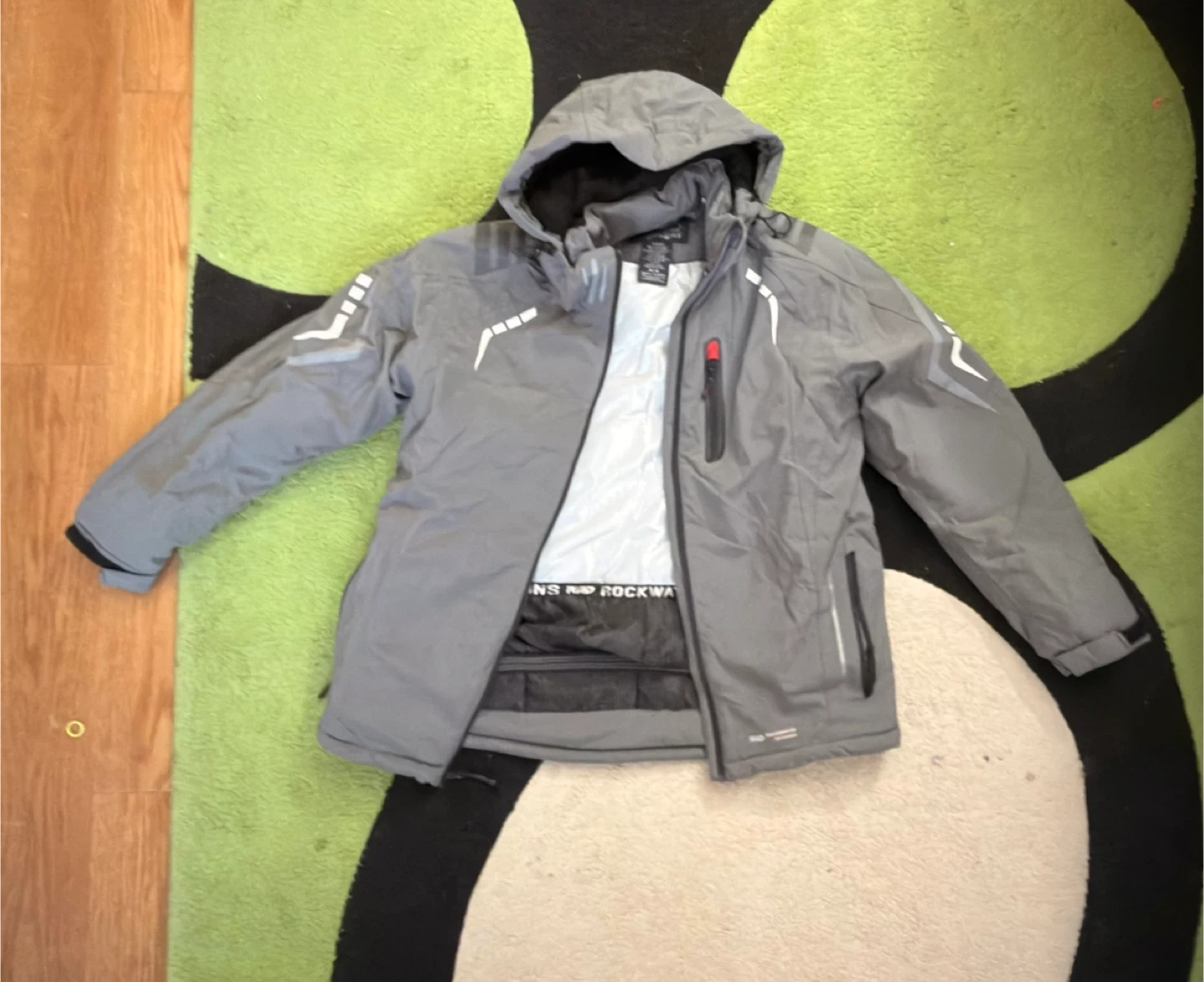 Selling a Rockwater Designs winter jacket in gray. It's in great condition and ready for the cold weather! It features a hood and several pockets for storage.