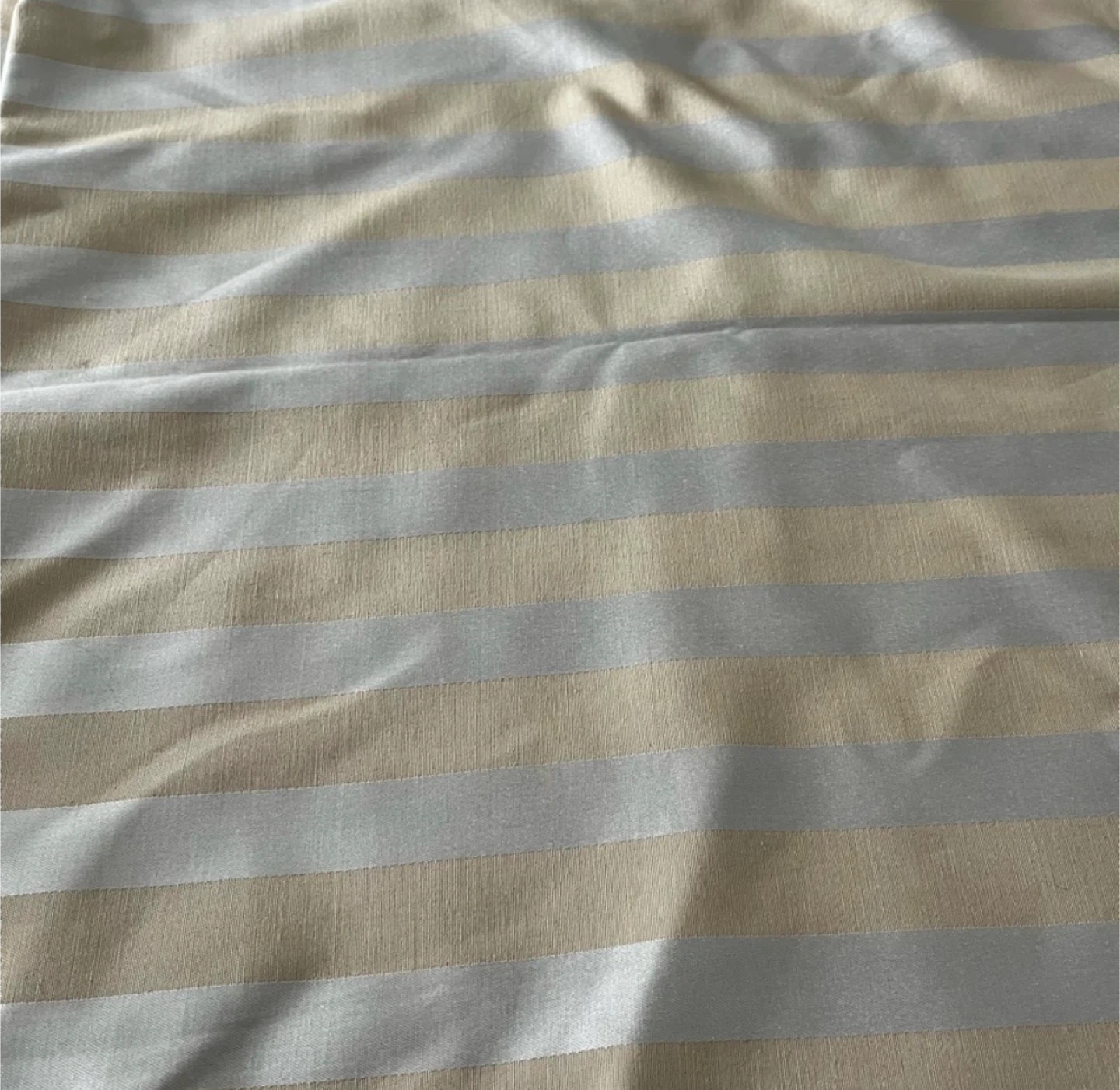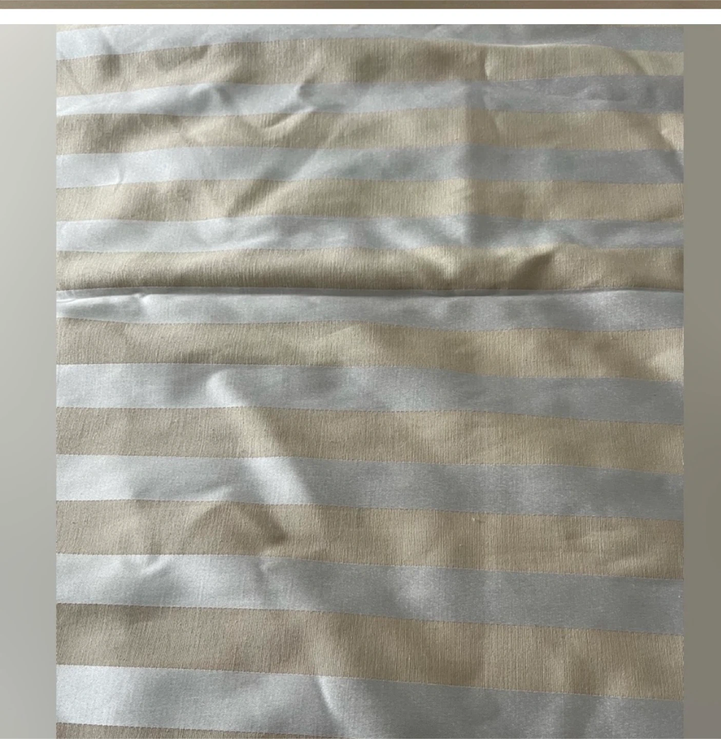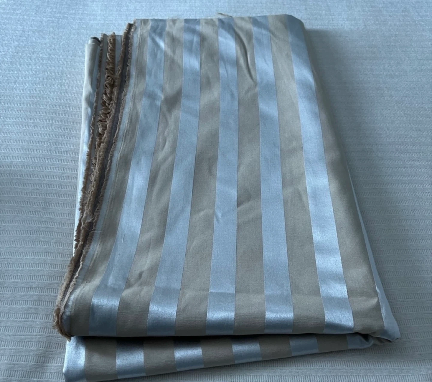 Here's a piece of fabric with a nice striped pattern! It's a blend of beige and silver, and could be great for a variety of sewing or crafting projects. The material has a slight sheen to it. It's in good condition and ready for its next creative use