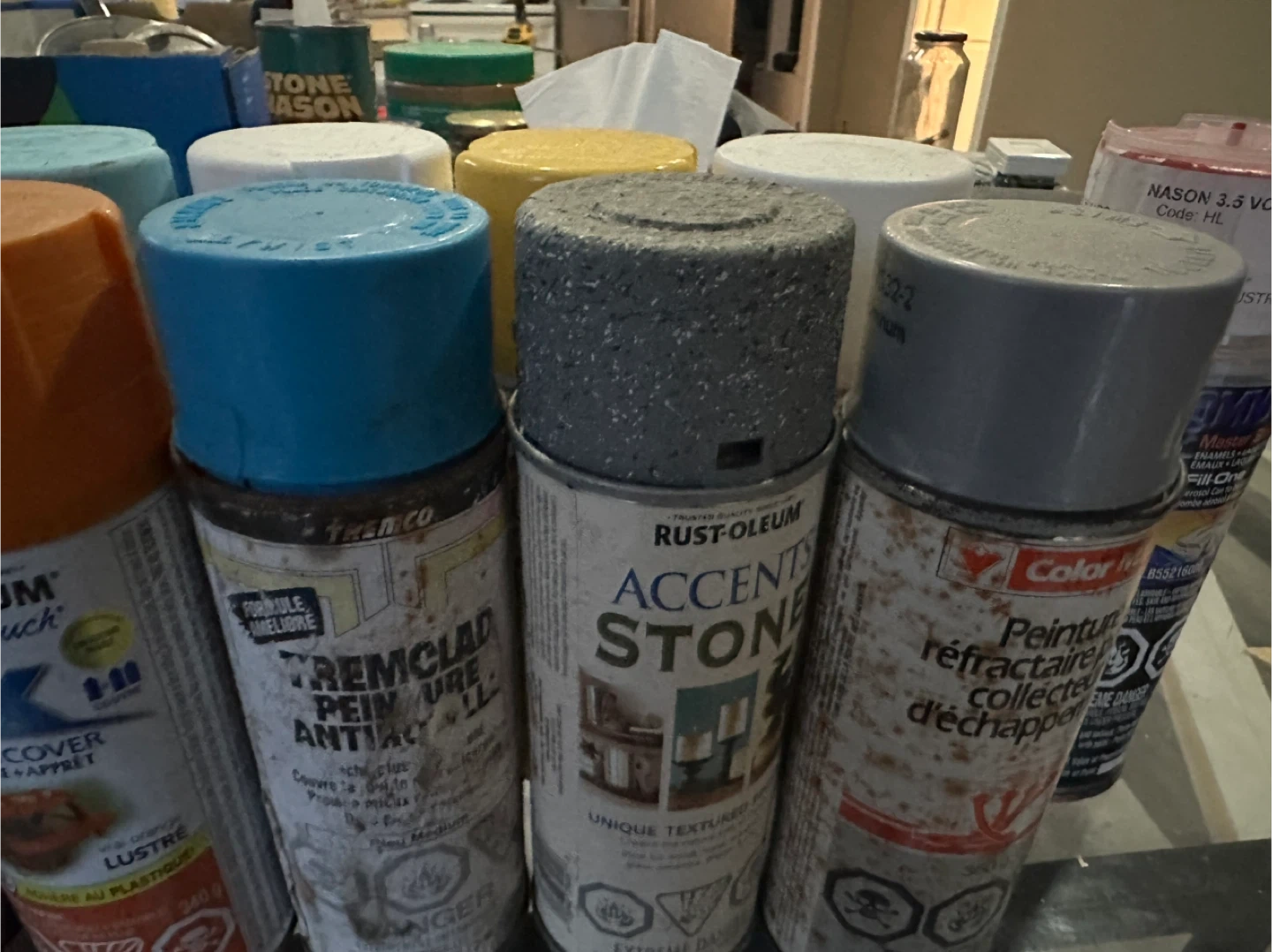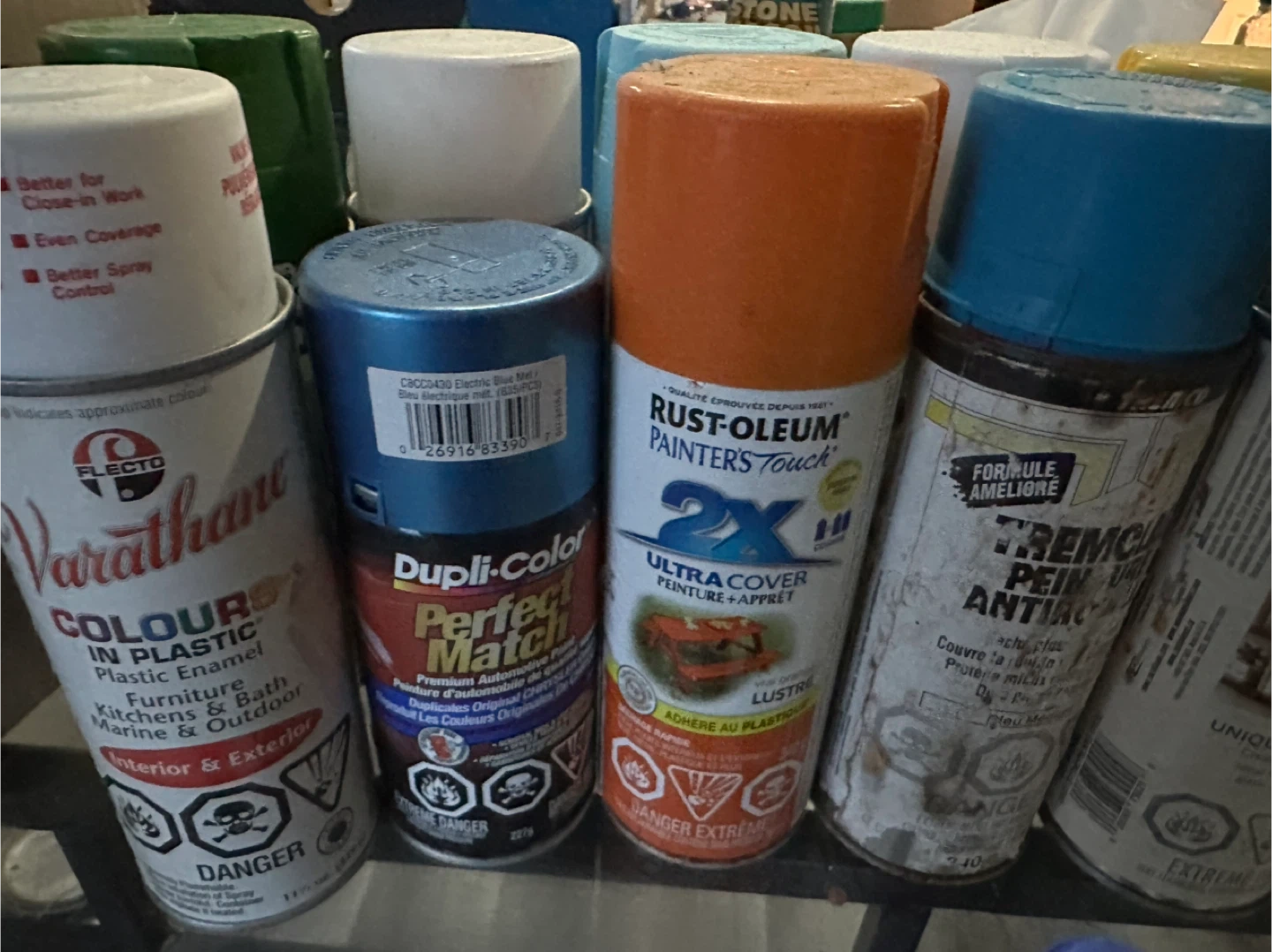 spray paint cans. There's a variety of colours and brands, including Rust-Oleum, Tremclad, and more! Great for DIY projects or touch-ups