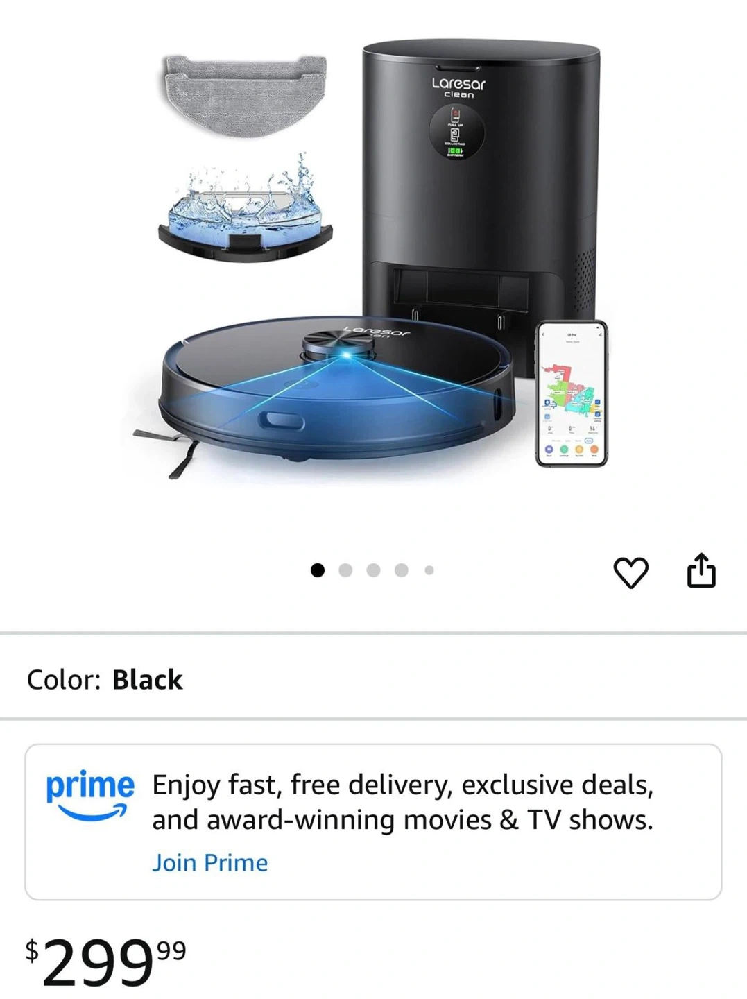 Selling a Laresar robot vacuum cleaner in black. It comes with the charging dock and app connectivity. Keep your floors clean with this handy device! Laresar Robot Vacuum and Mop Combo, 3 in 1 Robotic Vacuum with 3.5L Self Emptyin Advanced LiDAR Navigation and Sensors】The L6 Pro robot vacuum is equipped with an advanced LiDAR system and superior environmental detection and collision avoidance performance that accurately generates maps for your house. It‘s easy for you to command the robot to complete the entire clean by operating it on your mobile phone.