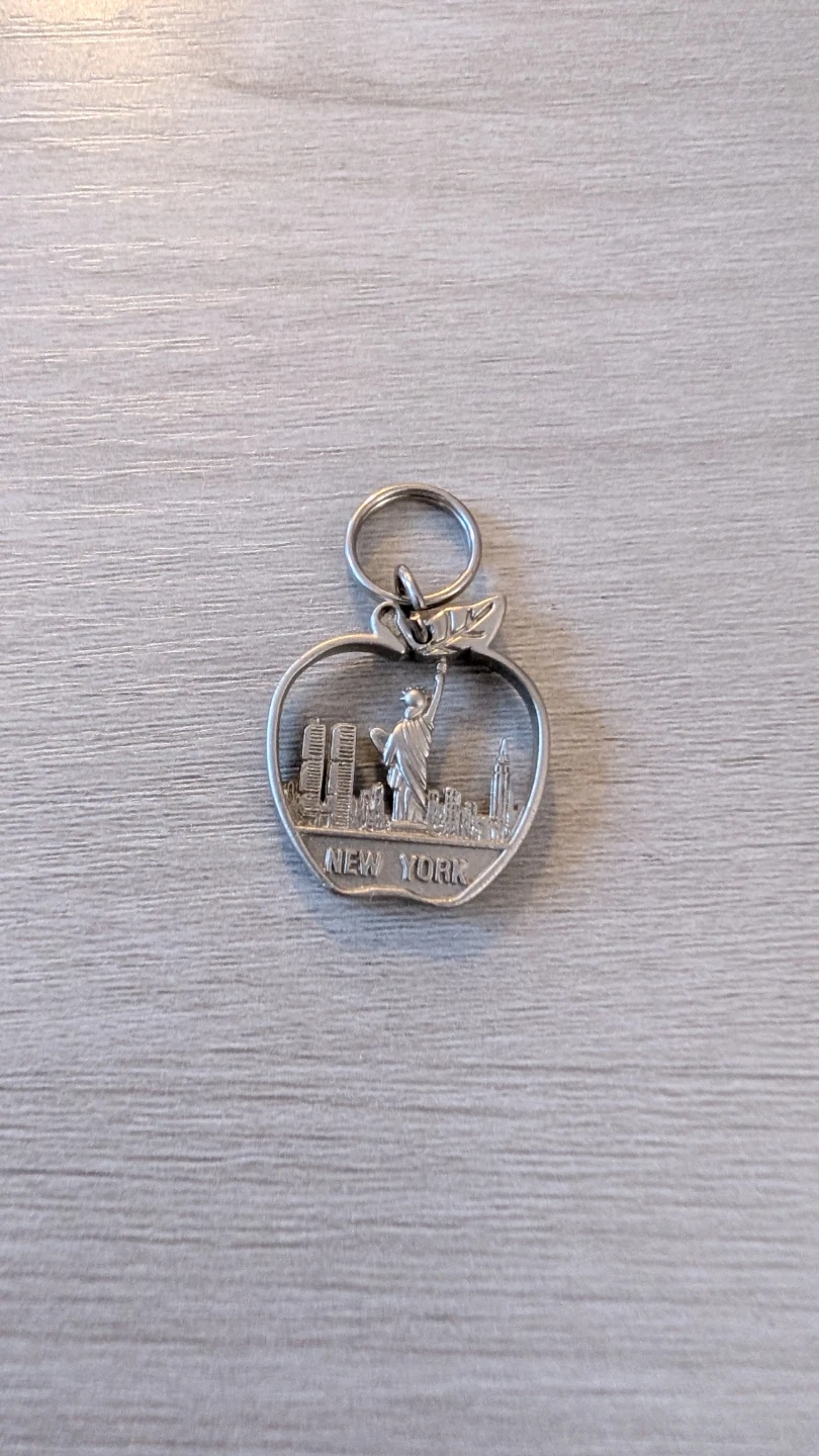 Here's a New York themed keychain, shaped like an apple! It features the Statue of Liberty and the city skyline. It also says "#1 Daughter" on the bottom.
