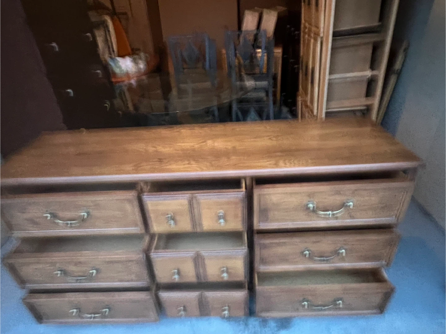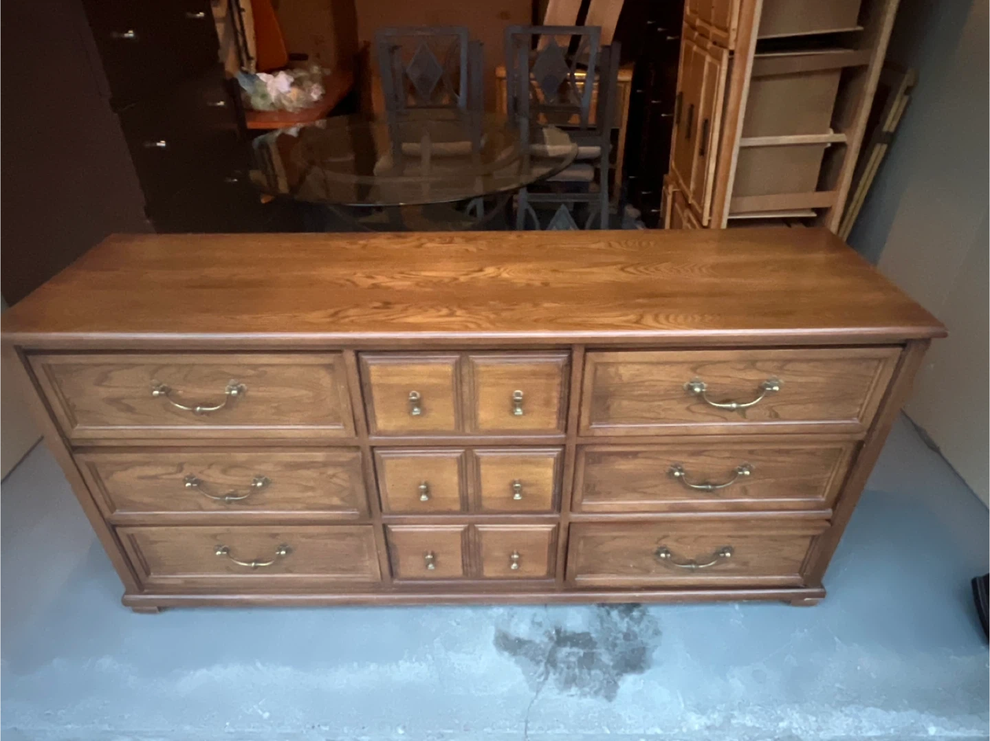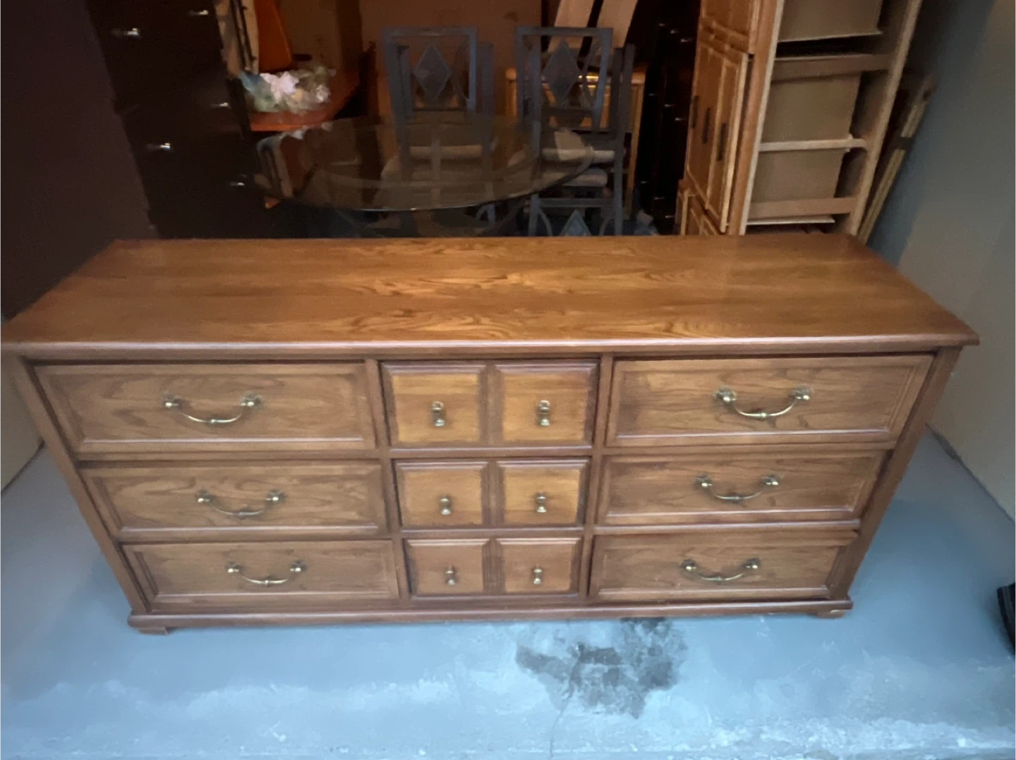 Here's a lovely wooden dresser with a classic design! It features nine drawers, offering plenty of storage space for your clothes and belongings. The dresser is in good condition and would be a great addition to any bedroom or living space
