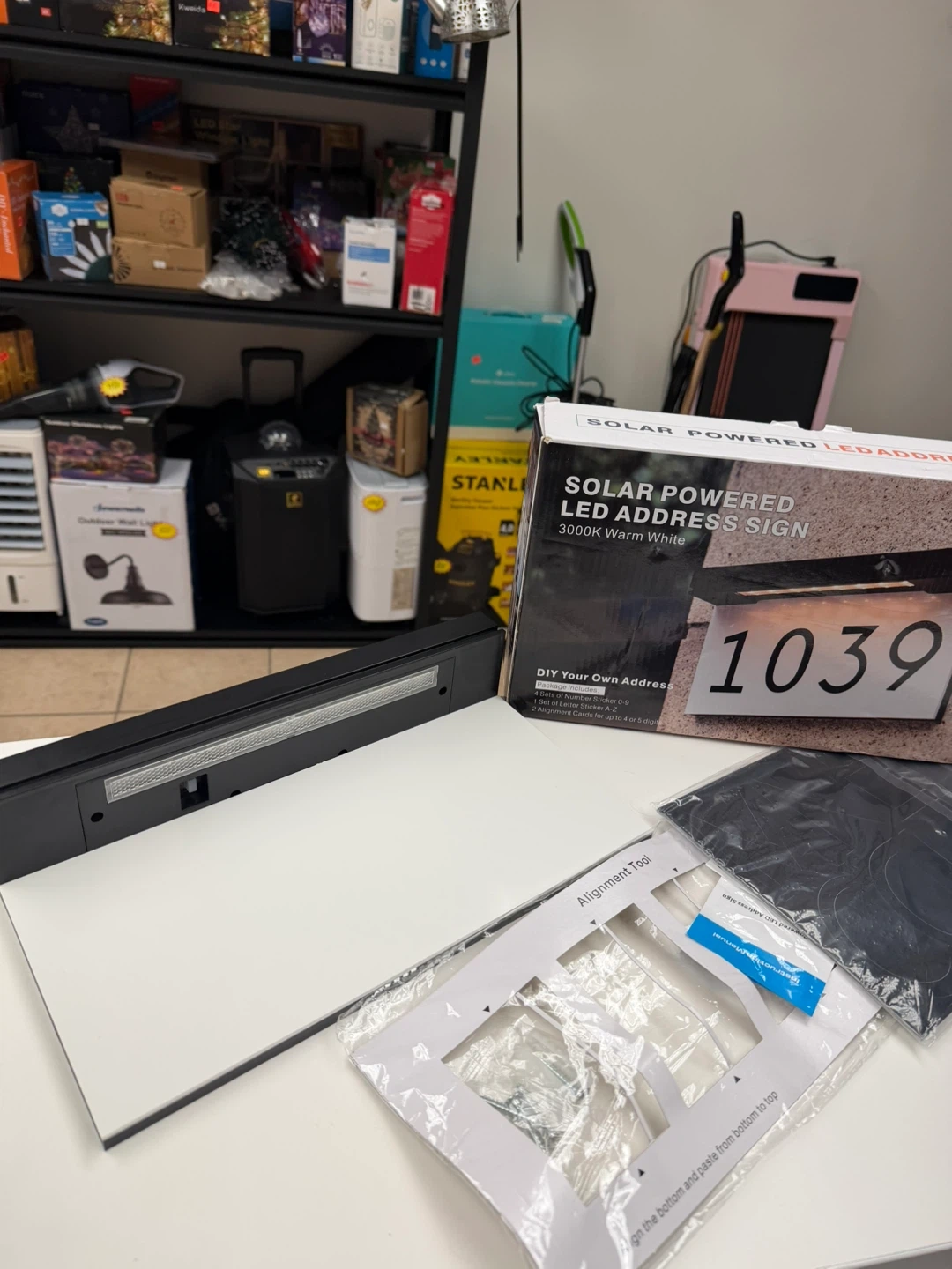 I'm selling a brand new solar-powered LED address sign. It comes with a package that includes: