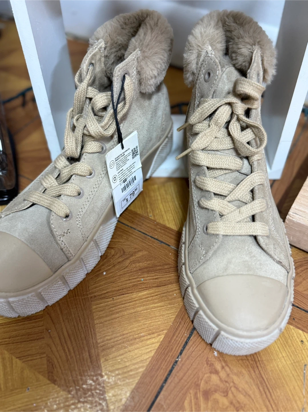 These beige high-top sneakers are in great condition! They feature a suede exterior with a furry lining around the ankle. The tag shows they were originally $79.99