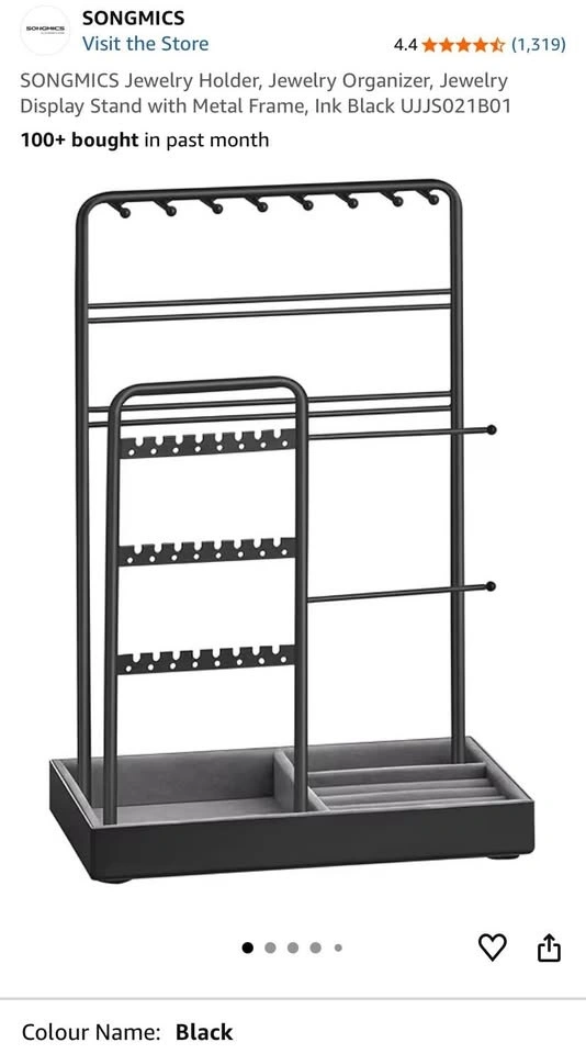 Upgrade your vanity with this SONGMICS Jewelry Holder β the perfect blend of elegance and practicality. With its sleek metal frame and ink-black finish, this stand displays your favorite pieces while keeping them tangle-free and easy to grab.
