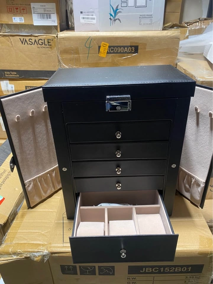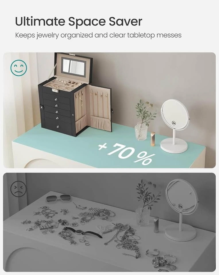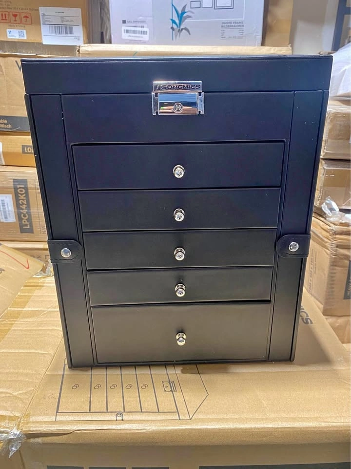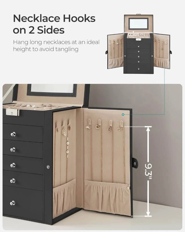 Keep every piece of your collection organized, protected, and easy to find with the SONGMICS 6-Tier Jewelry Box. Designed in elegant black, this spacious organizer features 5 smooth drawers, a built-in mirror, and a lockable design for added security.