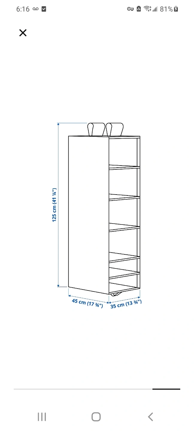 Here's a handy grey hanging organizer from Ikea! It's perfect for maximizing closet space and keeping things tidy. Its dimensions are approximately 41 1/4" tall, 17 3/4" wide, and 13 3/4" deep