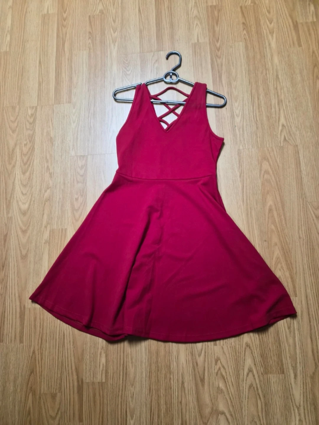 Here's a cute red sleeveless dress! It has a flattering fit and flare shape, perfect for a casual day out or dressing up for an evening event. The criss-cross back adds a stylish detail
