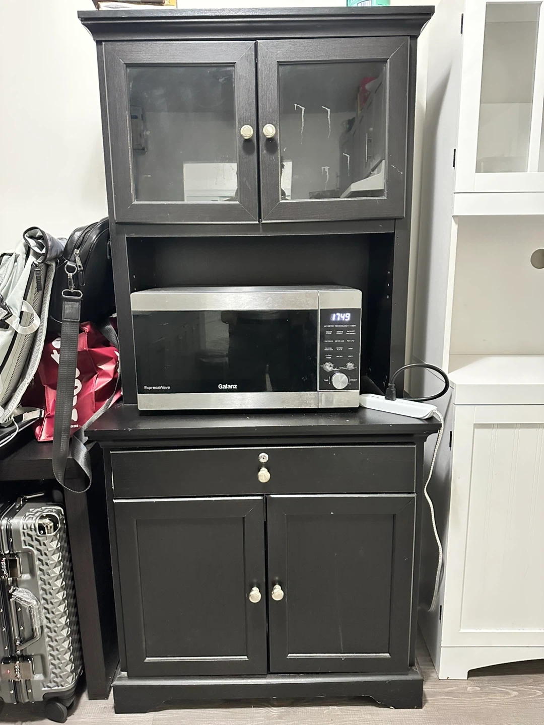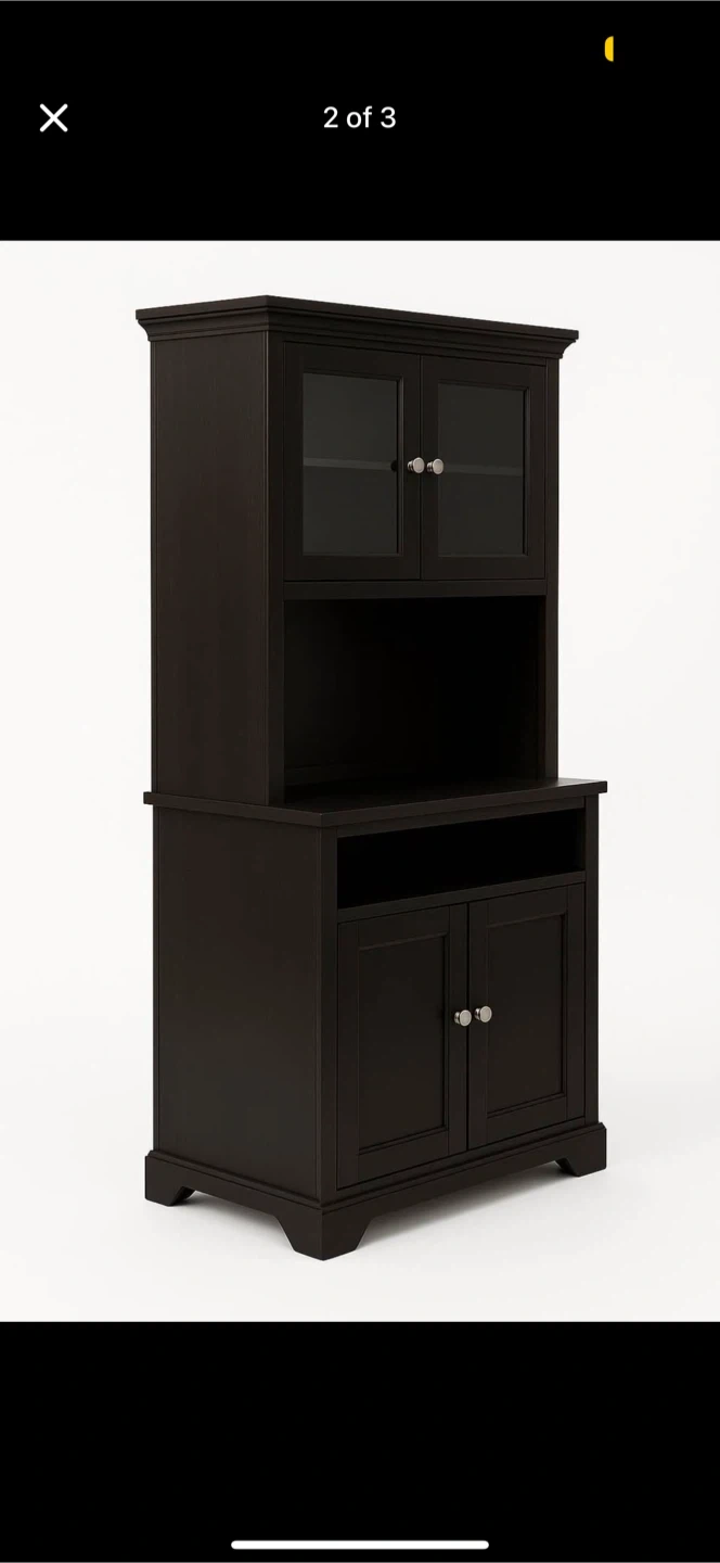 Selling a lovely espresso-coloured wood buffet with a hutch. It features glass doors on the upper cabinet and ample storage space below. Perfect for adding a touch of elegance to your dining area or kitchen!
