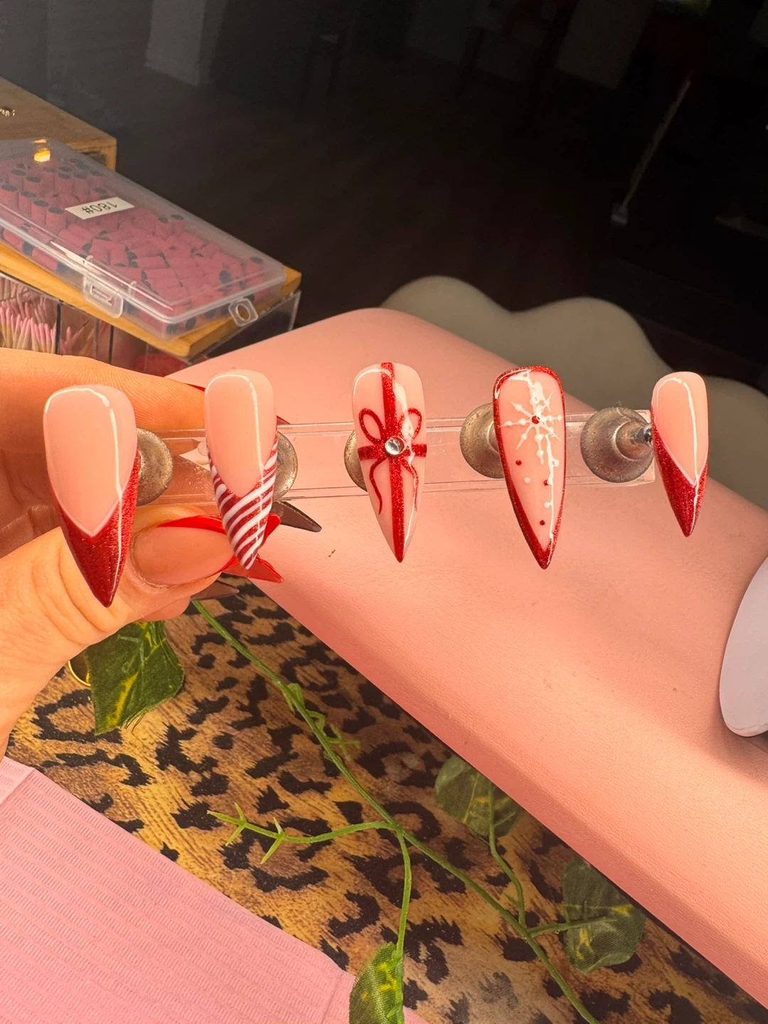 Here is a cute set of Christmas themed nails! Hand painted and ready for your hands! 25$ for the set or 30$ to have them glued on for you! Sizes are from thumb to pinky. 2,6,5,7,10 (size)