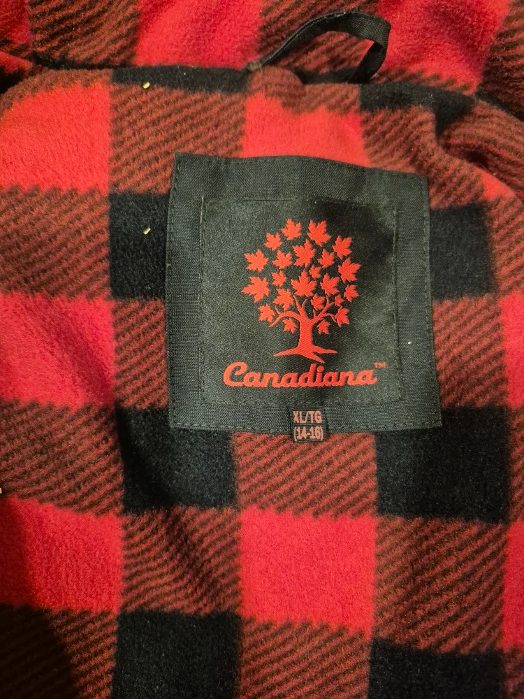 Selling a Canadiana girls' parka, size XL (14-16). It's black on the outside with a red and black plaid lining and a faux fur-trimmed hood. Perfect for keeping warm this winter or a gift as it also fits a women's size small! Pet, scent and chemical free household! #cleanout
