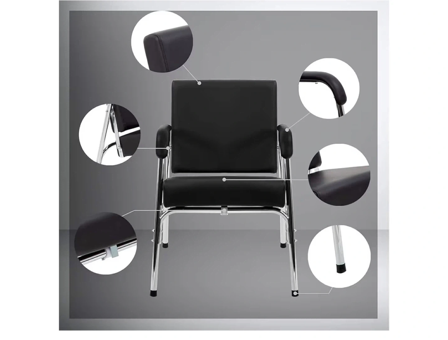 This black salon chair features a sleek chrome frame and is in new condition. It's perfect for a salon or home setup. The chair measures approximately 24 inches wide, 31 inches tall, and 22 inches deep, offering comfortable seating for clients.