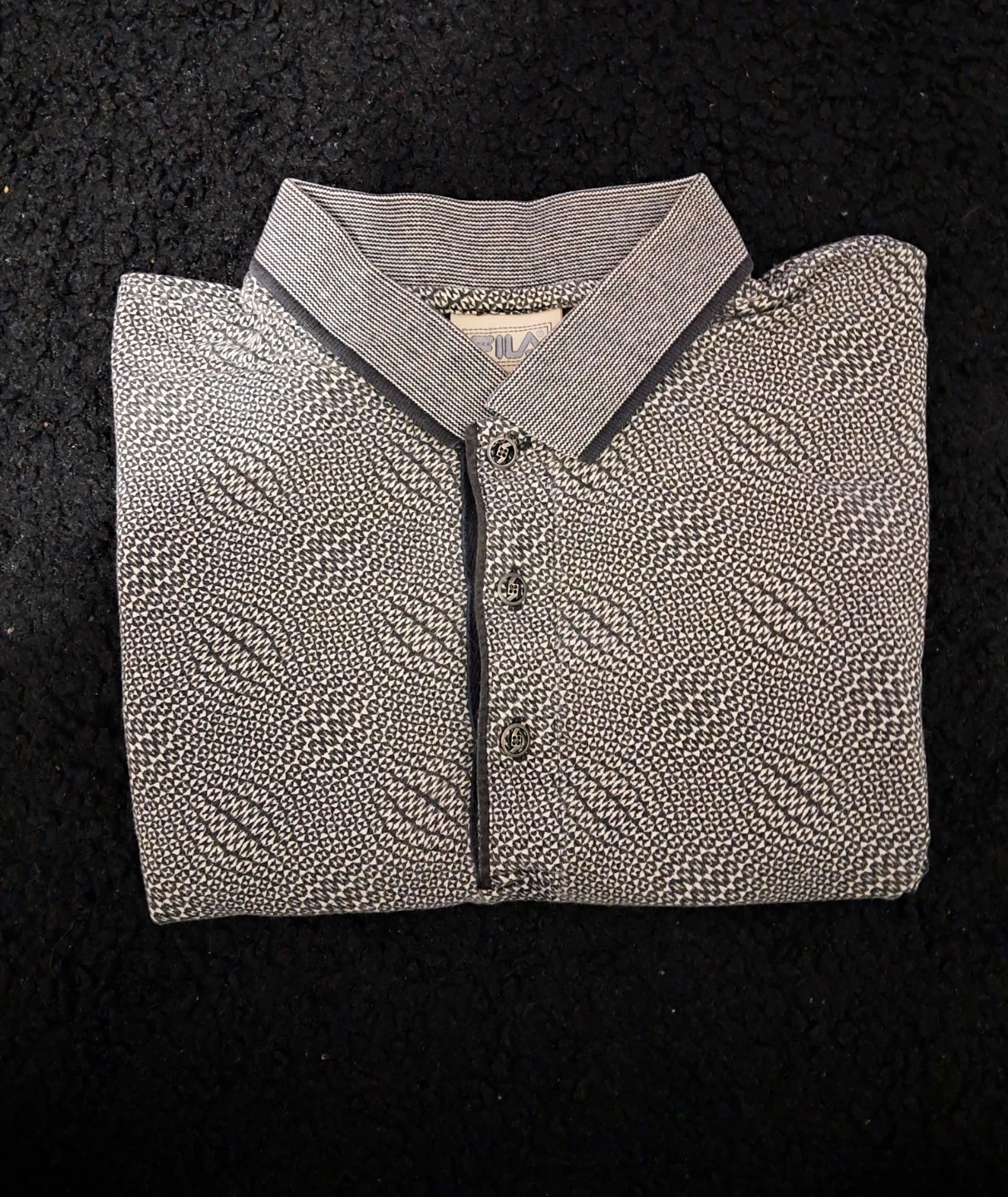 Selling a Fila polo shirt with a unique patterned design! It's a size medium and in great condition. Perfect for a casual day out or a sporty look. Check out the photos for the details!