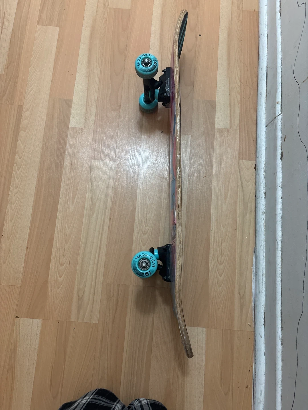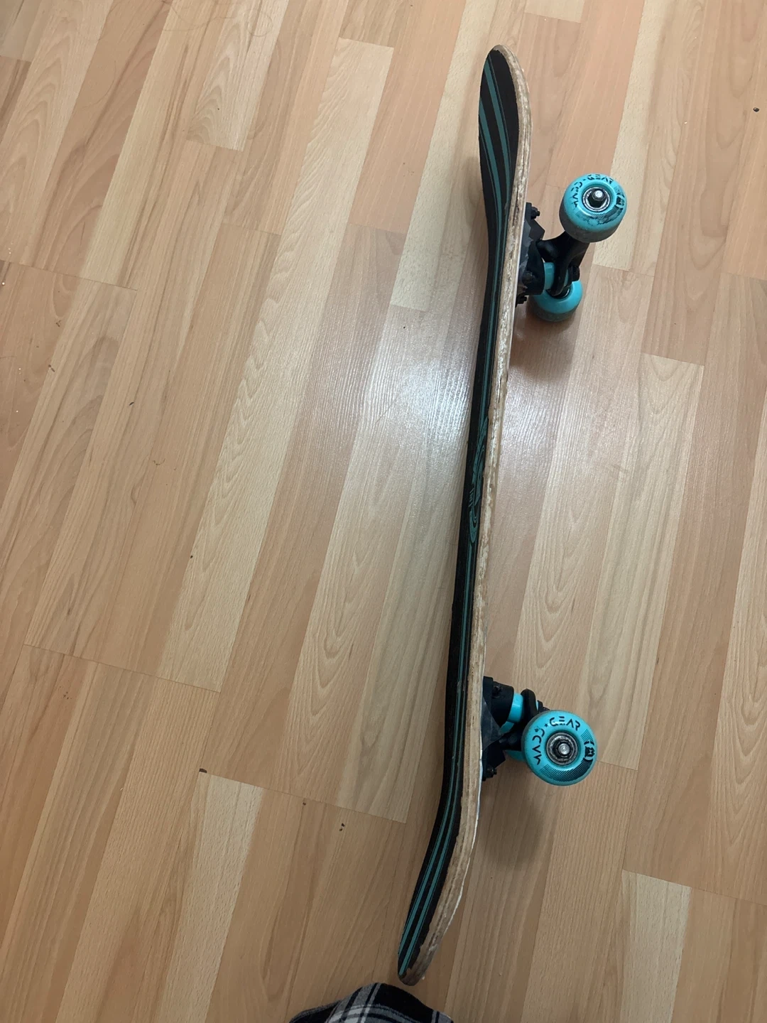 Selling a Madd Gear skateboard! It has a cool robot design on the front and stripes on the back. The wheels are teal. It's in good used condition and ready for some fun