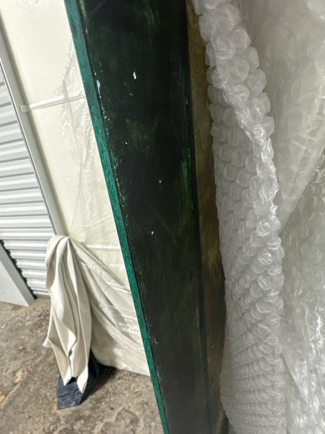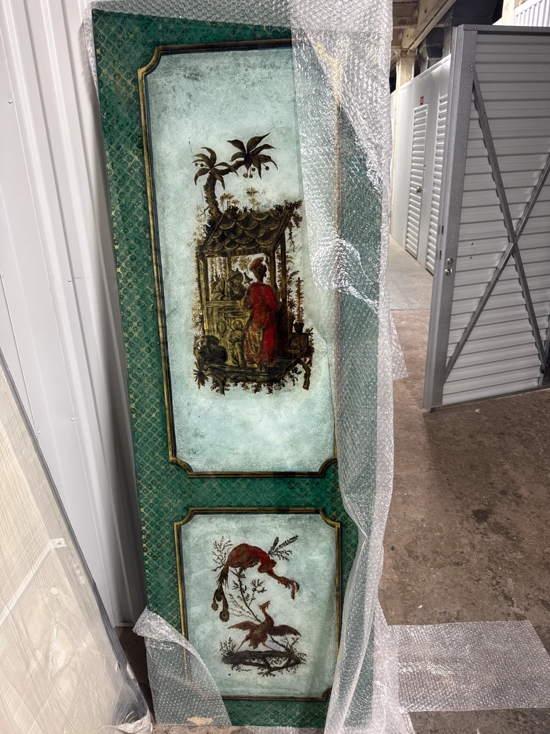 This decorative wall panel features a unique design with birds and people. The panel is green and gold. It's in good condition and ready to add a touch of elegance to your home decor