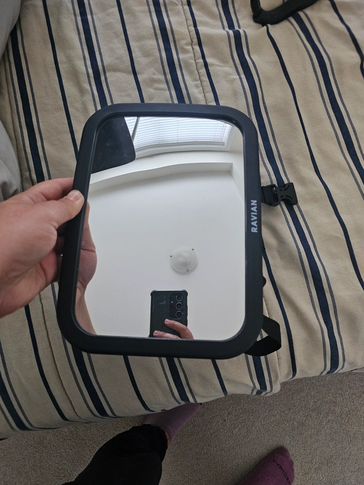 Selling a Ravian baby car mirror in black. It's in great condition and ready to use! This mirror helps you keep an eye on your little one while driving, providing peace of mind on the road