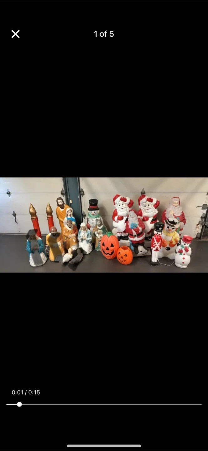 Selling a collection of vintage blow mold decorations for Christmas and other holidays! Includes a nativity scene, snowmen, Santas, pumpkins, and more. Great for adding a retro touch to your holiday decor
