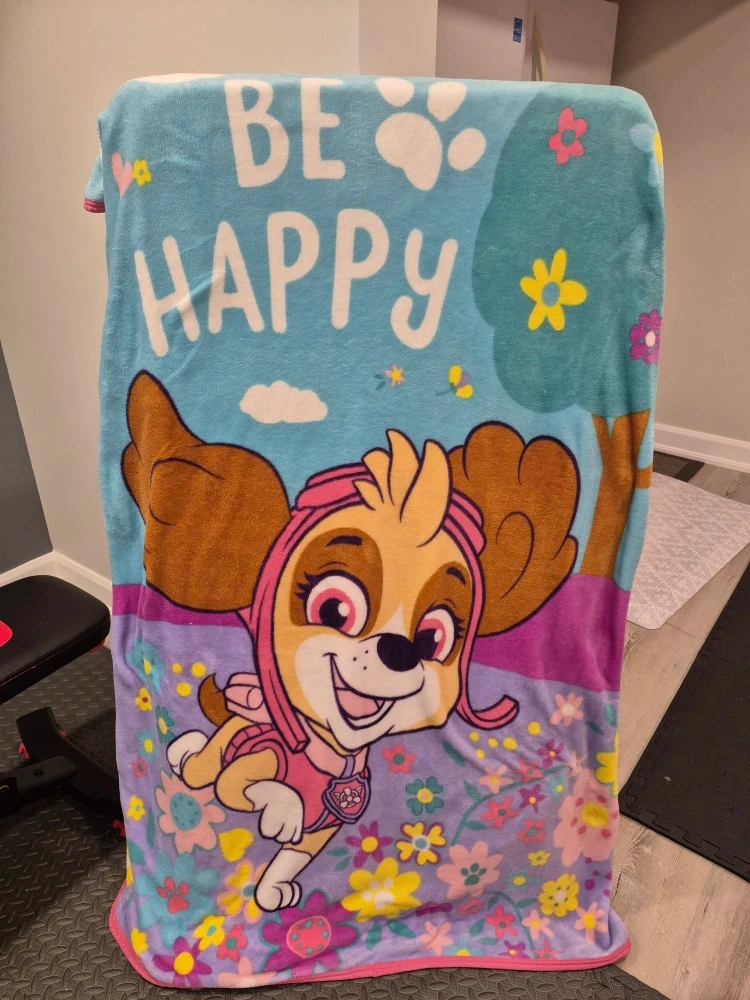 Selling a cute Paw Patrol Skye plush toy along with a matching blanket! The blanket has a fun 'Be Happy' design with Skye, flowers, and trees. The plush is in great condition and ready for a new home. Perfect for any Paw Patrol fan!