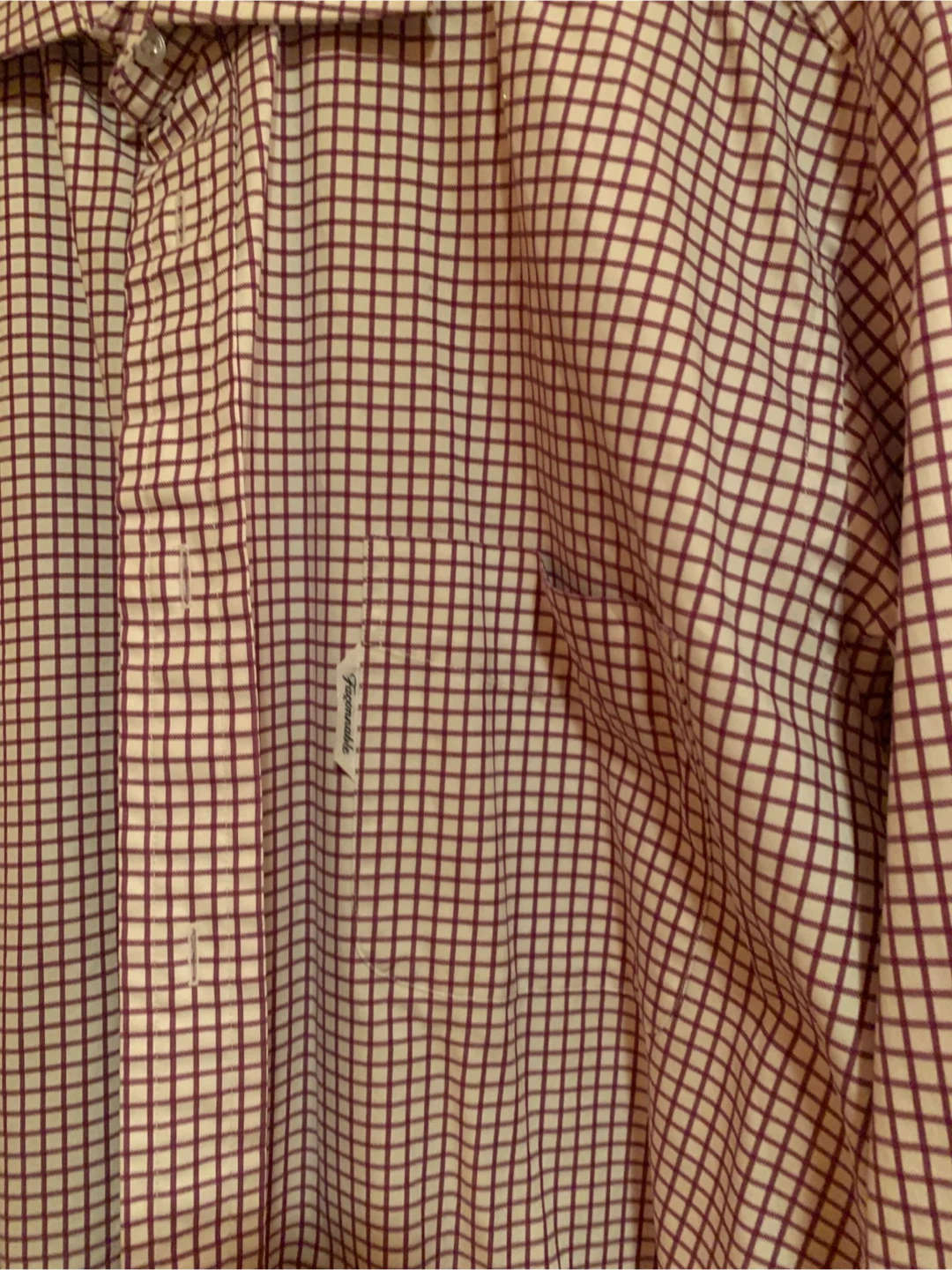 Gently used Faconnable dress shirt in size 16 1/2 R. It features a classic checkered pattern in white and burgundy. Made from 100% cotton and designed in France, this shirt is both stylish and comfortable!