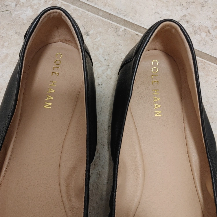Selling a pair of Cole Haan flats in black leather. They're in good condition and have the Cole Haan logo on the front. in great shape. They're a classic and comfortable style!