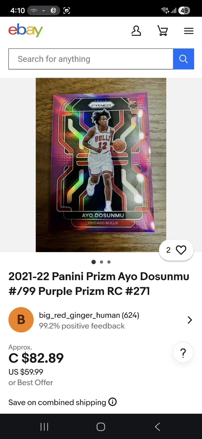 1 / 31 / 3Buy & SellAyo Dosunmu 2021-22 Panini Prizm RC purpleAyo Dosunmu 2021-22 Panini Prizm RC purple$41Selling an Ayo Dosunmu 2021-22 Panini Prizm basketball card. It's a rookie card, numbered #271. The card is a purple prizm and numbered 81/99.ConditionLike newWHERE TO MEETGuildford Town CentreView MapSELLERverifiedWinstonGuildford24114 reviews0 chats·0 favorites·11 viewsSEND CHAT TO SELLERHi Winston! I’m interested in your listing.Hi Winston! I’m interested in your listing.Get the Karrot app to chatSign In to chat
