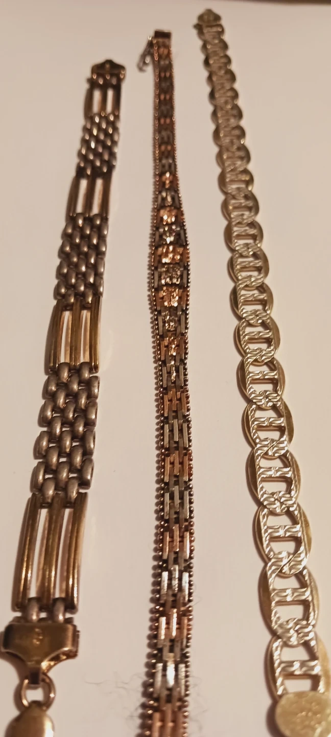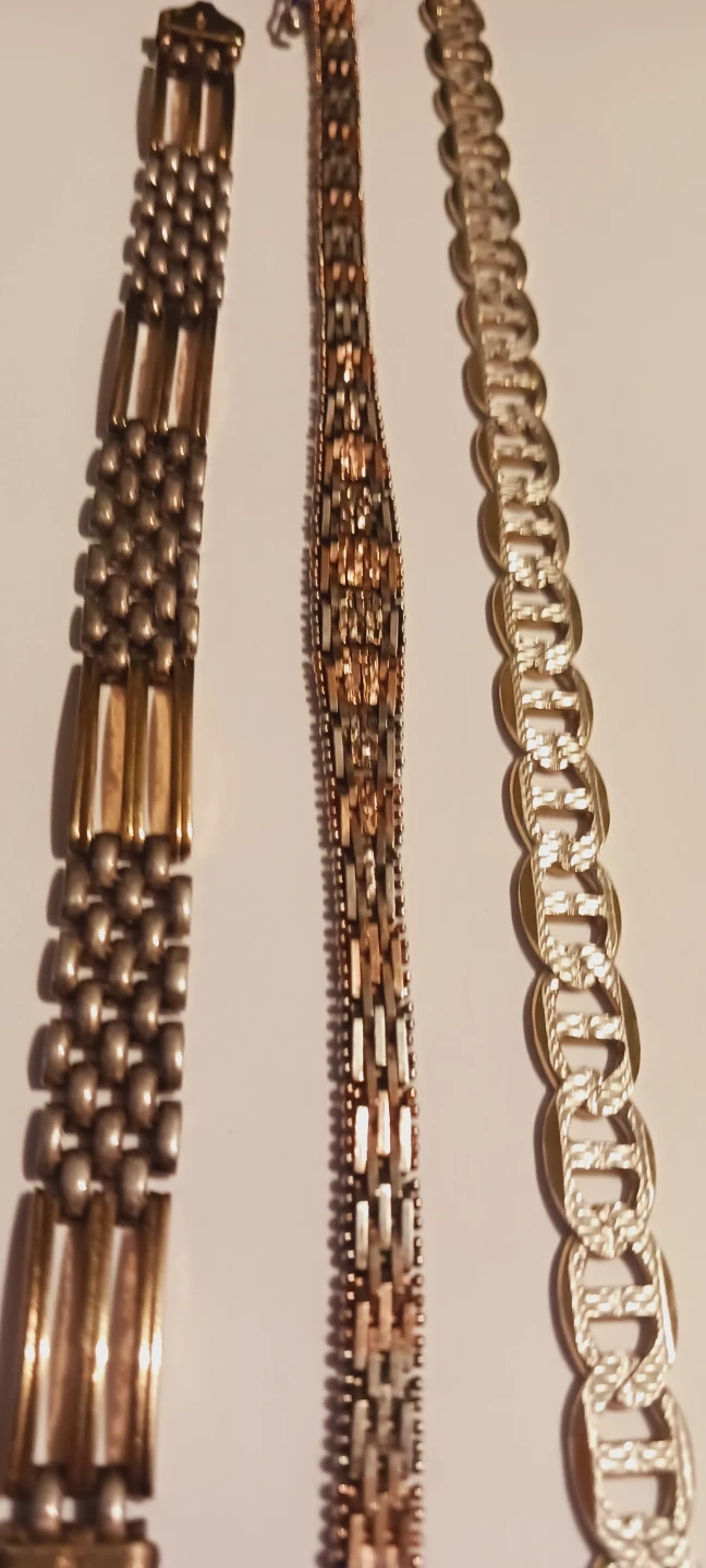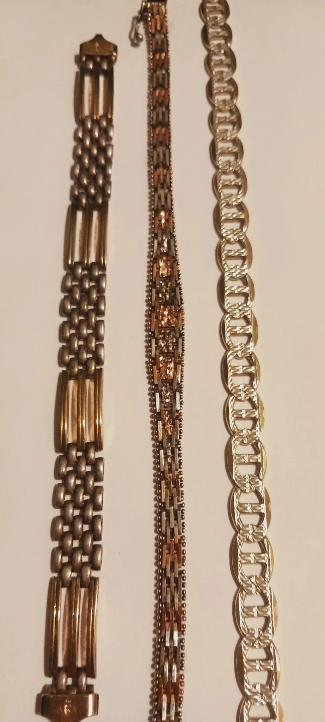 3 × BEAUTIFUL STERLING SILVER 925 stamped Italian bracelets. $45 each. Or $125 for all of them. First bracelet is 7", the second one is 7.5" and the third Mariner link is 8"long. They have a unique design. Perfect for adding a touch of style to any outfit !! $45 each or $120 for all of them. EXCELLENT CONDITION. ALL MY PRICES ARE NEGOTIABLE !!