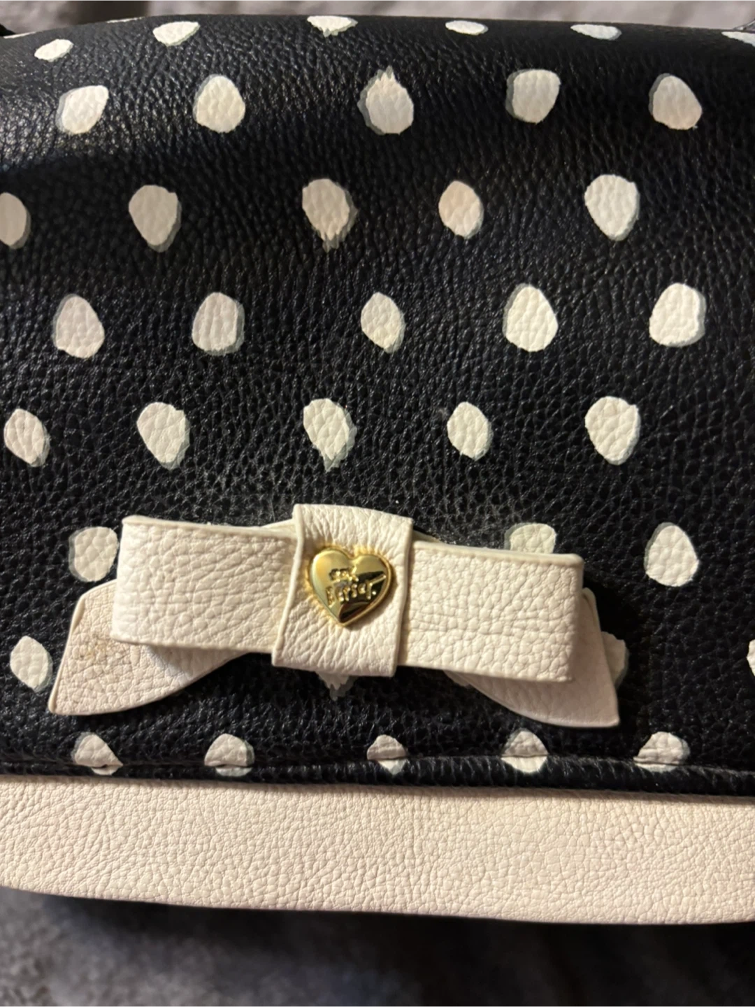 This Betsey Johnson insulated lunch bag is super cute with its polka dot design! It features a bow detail and heart accents. The bag is black and white and in great condition