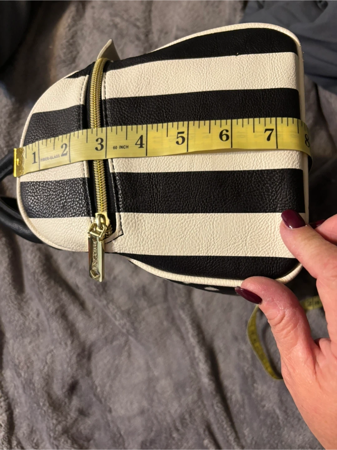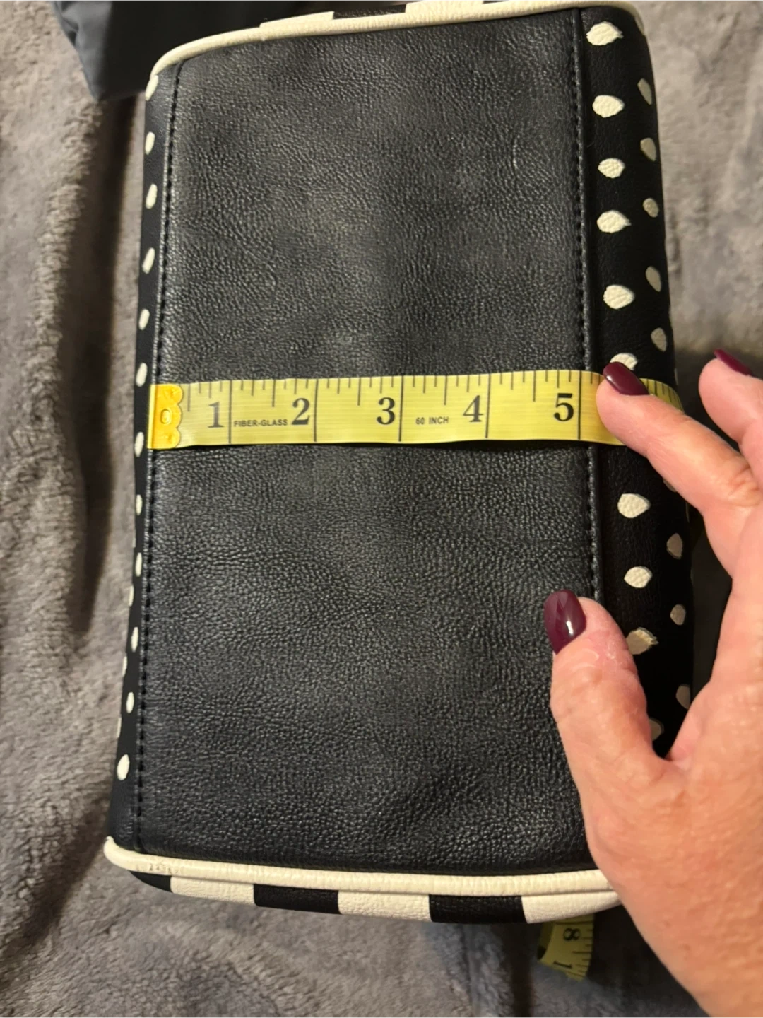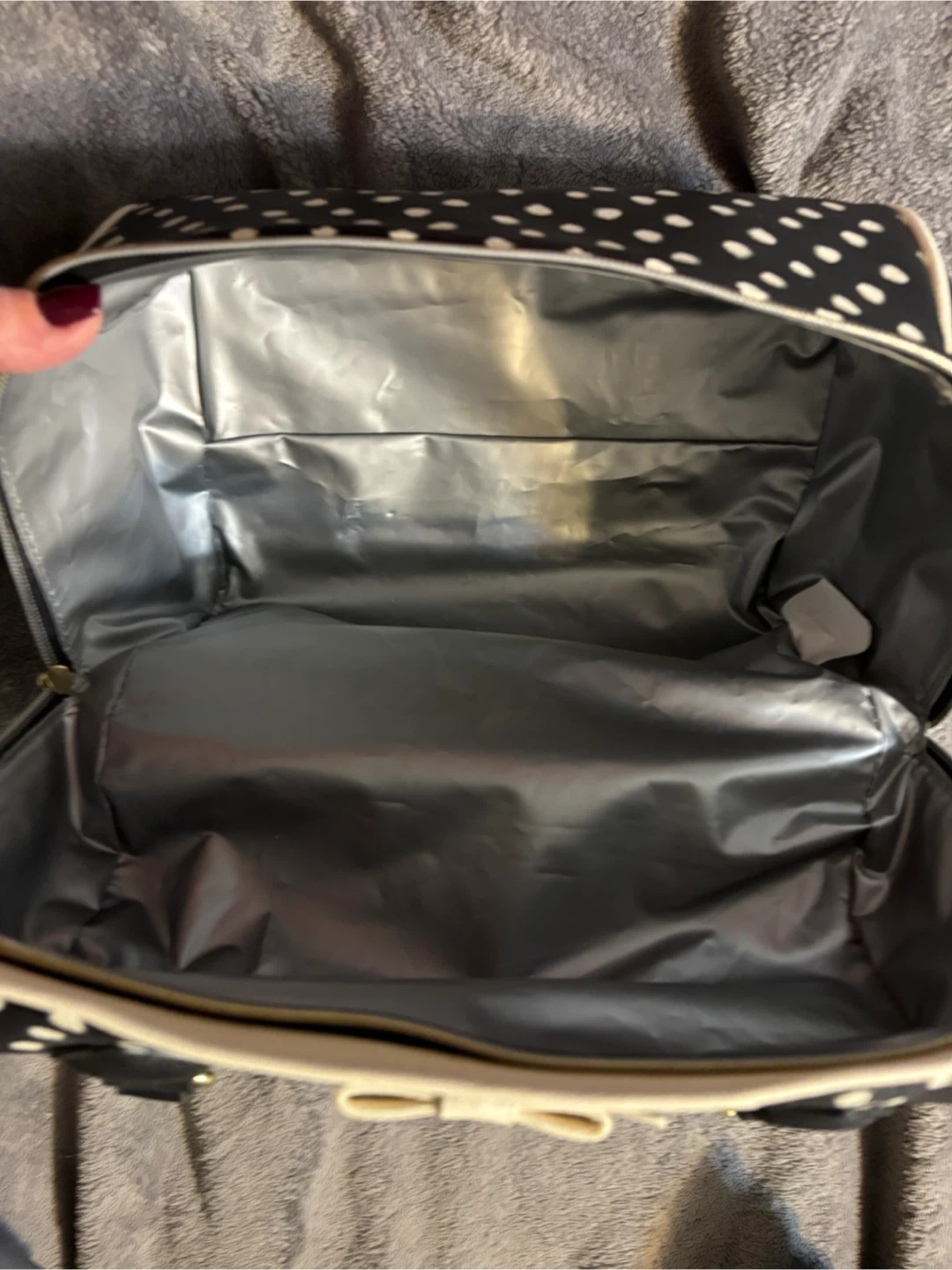 This Betsey Johnson insulated lunch bag is super cute with its polka dot design! It features a bow detail and heart accents. The bag is black and white and in great condition