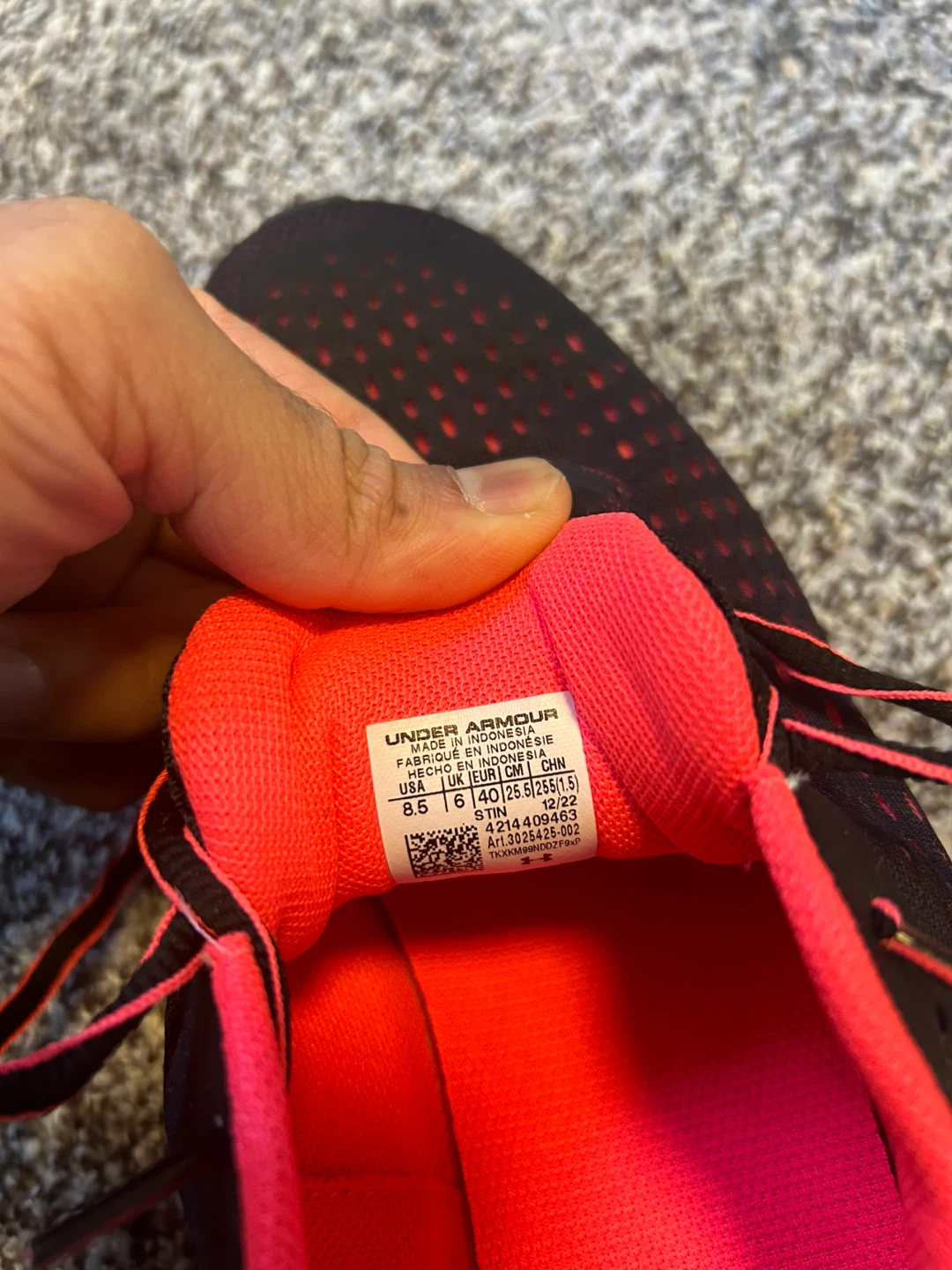 Selling a pair of Under Armour HOVR Turbulence running shoes in women's size 8.5. They are in great condition and come with the original box. The shoes feature a black and pink colour scheme. Perfect for running or everyday wear!