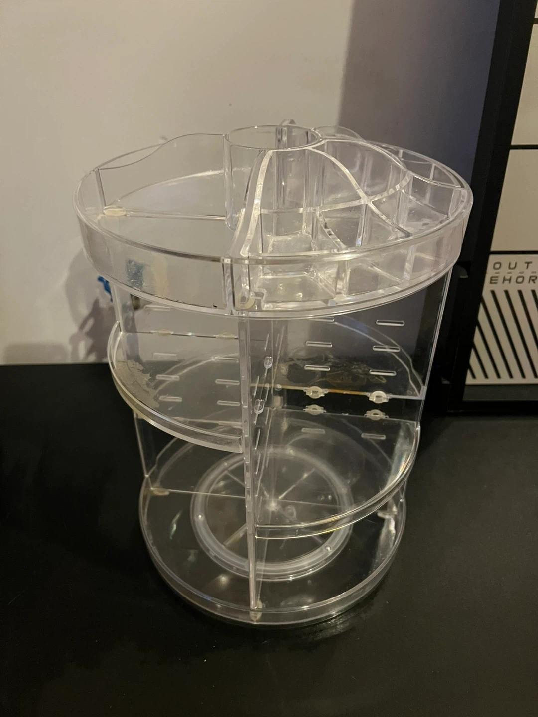 Selling a clear rotating makeup organizer. It's perfect for keeping all your cosmetics and beauty products neat and tidy! It features multiple compartments and tiers for easy storage and access. Great for vanities or bathrooms