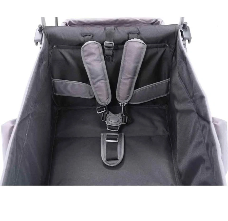 Integrated rear-wheel parking brake. Two 5-point safety belts pre-assembled