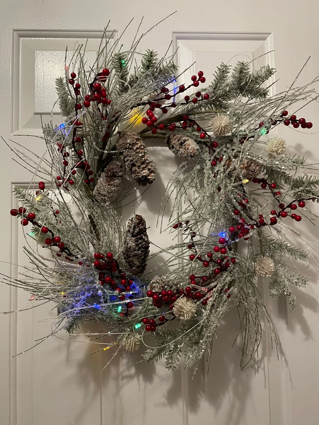 I added a battery operated light, but it’s removable. It’s a beautiful, original, Festive Christmas wreath with frosted branches, pinecones, and bright red berries.