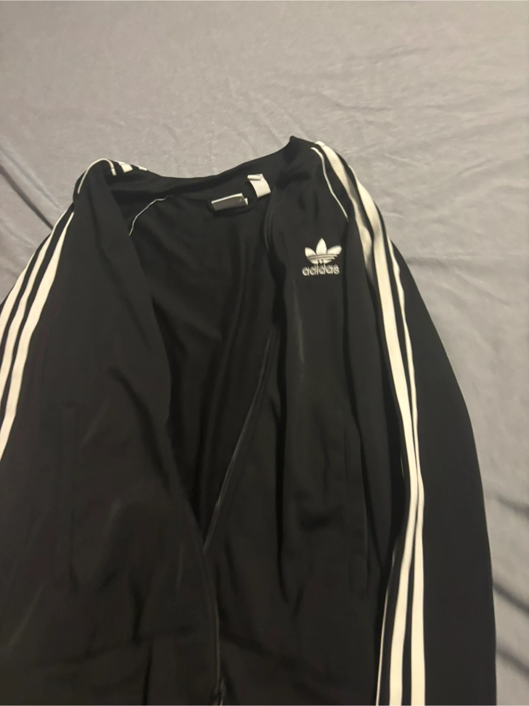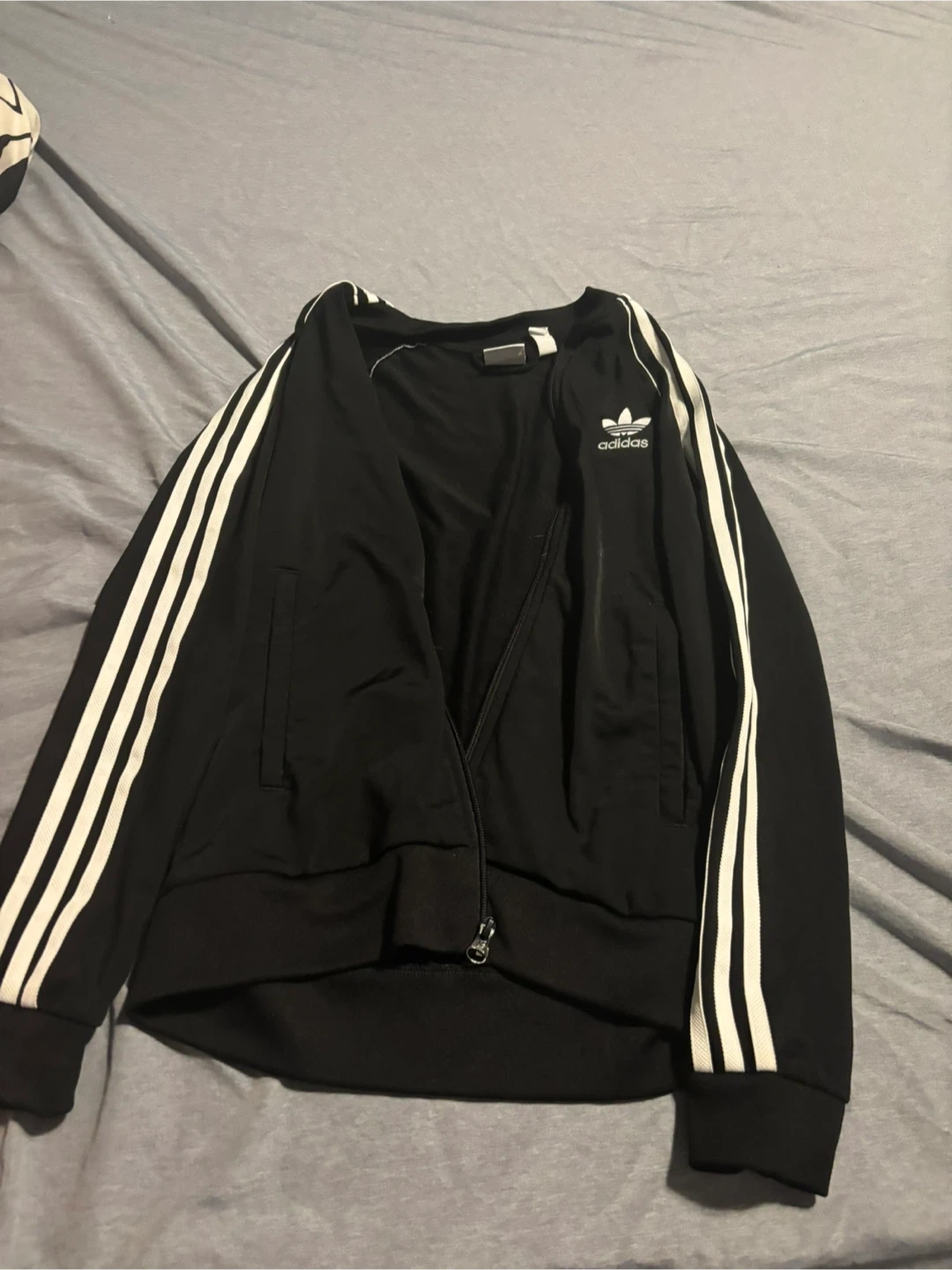 Selling a classic Adidas black track jacket! It features the iconic three stripes on the sleeves and the Adidas logo on the chest. Perfect for workouts or casual wear!