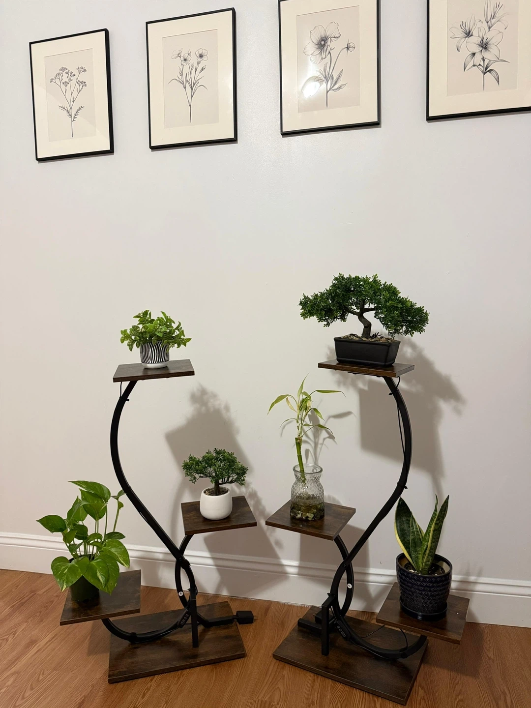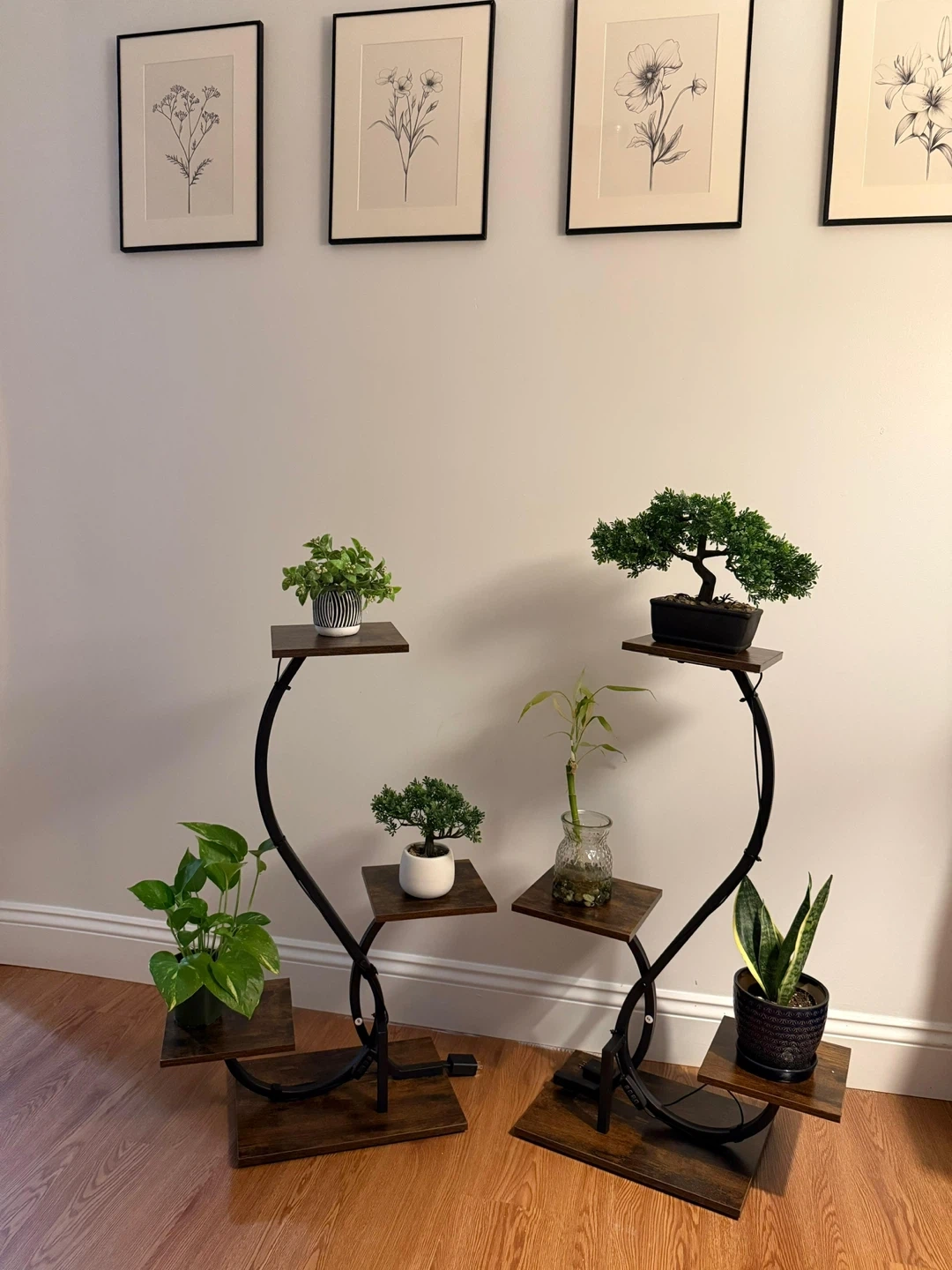 Selling a set of two plant stands. They're in great shape and ready to display your favorite plants! They have a unique curved design and a rustic wood finish.