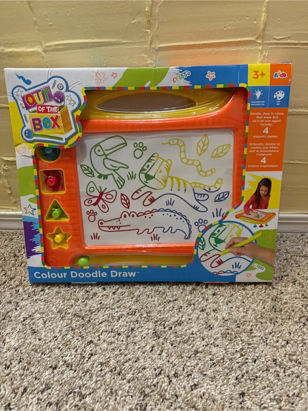 Brand new Colour Doodle Draw from Out of the Box! This set includes 4 magnetic stamps for extra fun. Doodle, draw in colour, then erase and do it all over again! Recommended for ages 3+