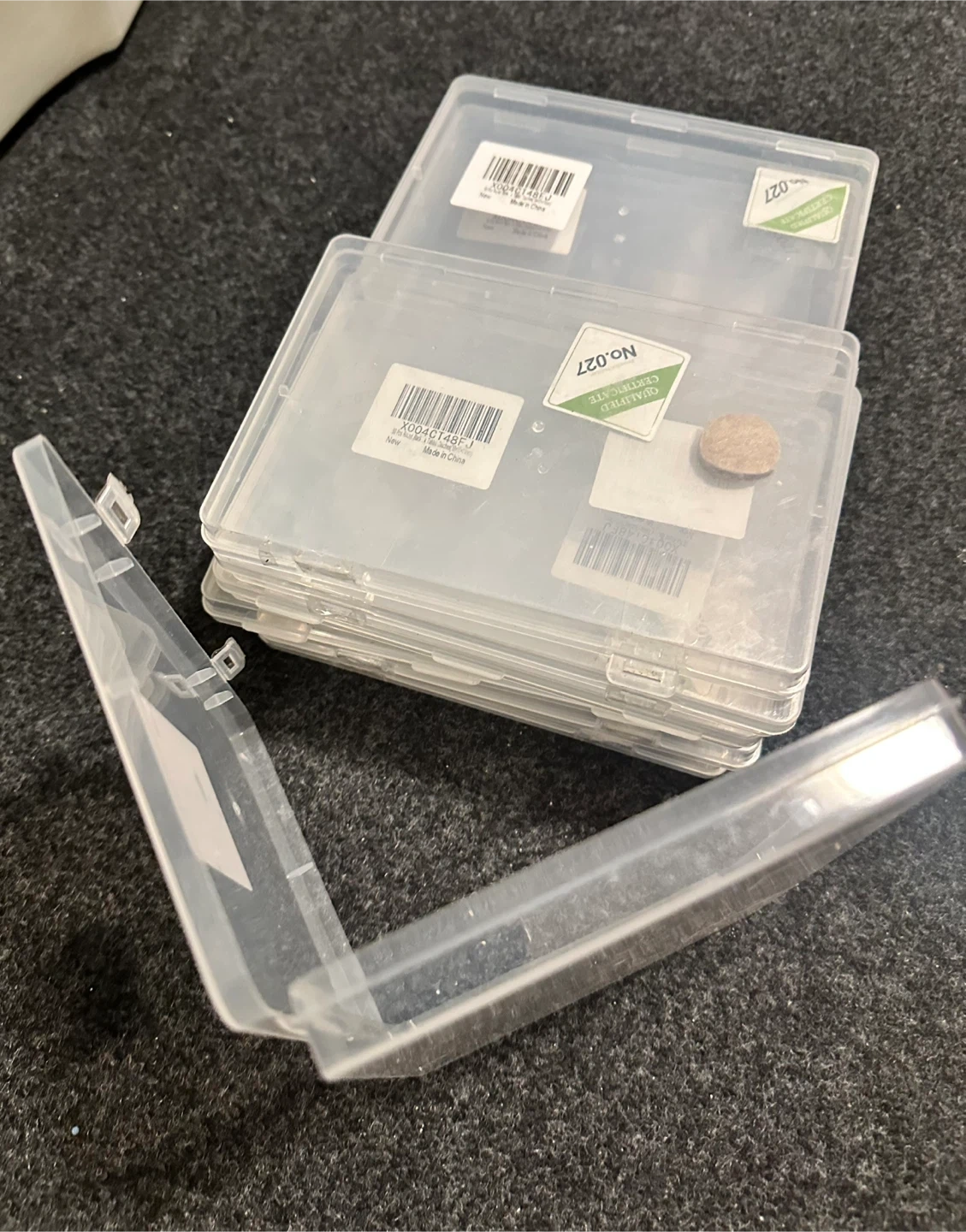 I have a set of 10 new clear plastic storage cases. They are perfect for organizing small items and keeping them safe and dust-free! They are in excellent condition and ready to use