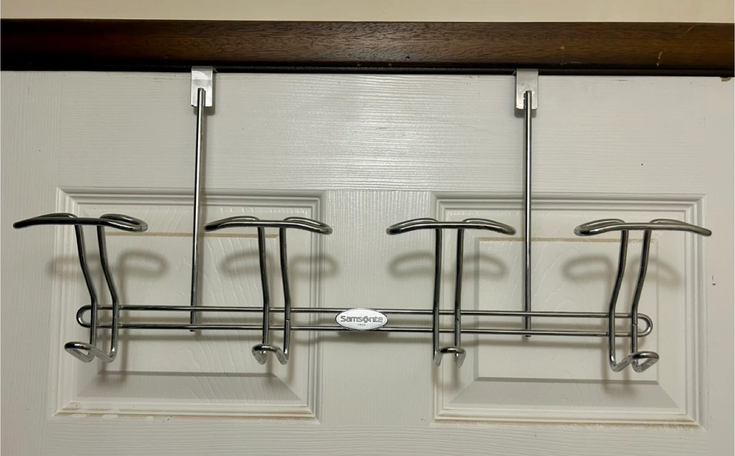 This is a Samsonite over-the-door valet hook, designed to hang over any standard door, offering eight hooks for organizing clothing, hats, and accessories. This item is in used condition, showing some signs of wear but fully functional.